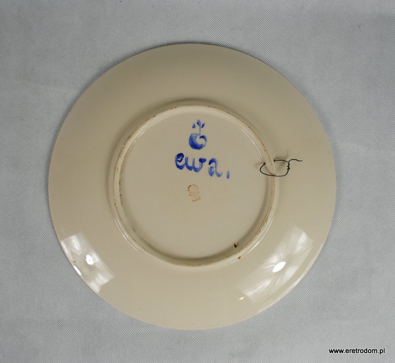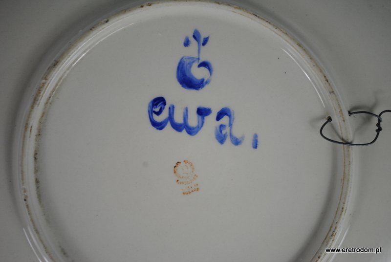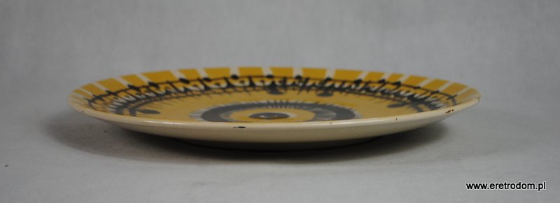 Duża patera naścienna wykonana z porcelitu Chodzież w latach 50-60 XXw. Malowana w stylu New Look, pikasso, na paterze króluje kolor musztardowy resztę talerza ozdabiają kolory czarny oraz biały, ze względu na tajemniczy podpis malarza talerz będzie stanowił ciekawy element w kolekcji.