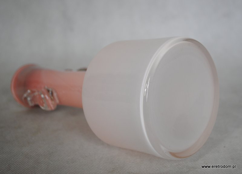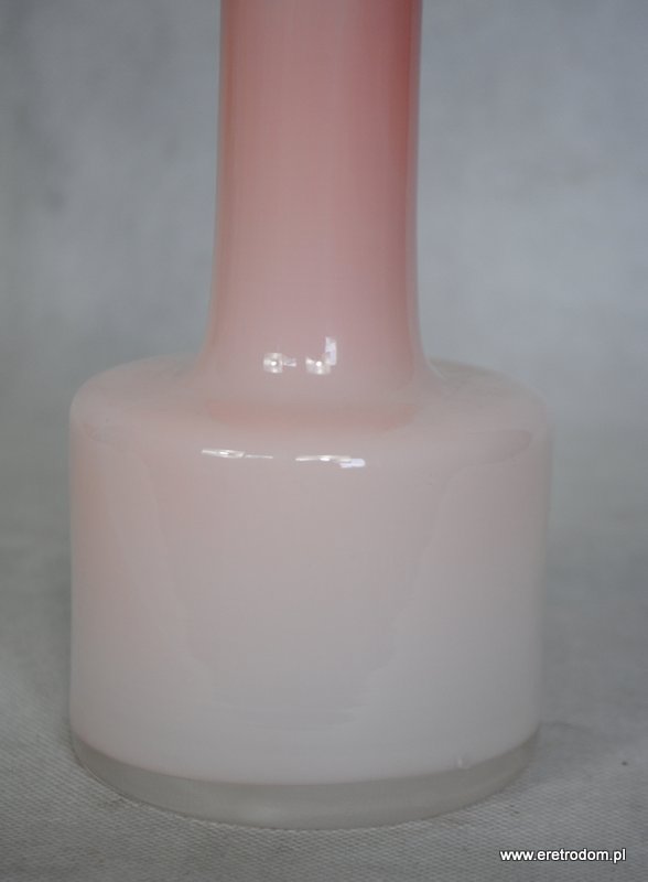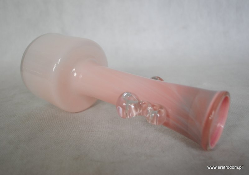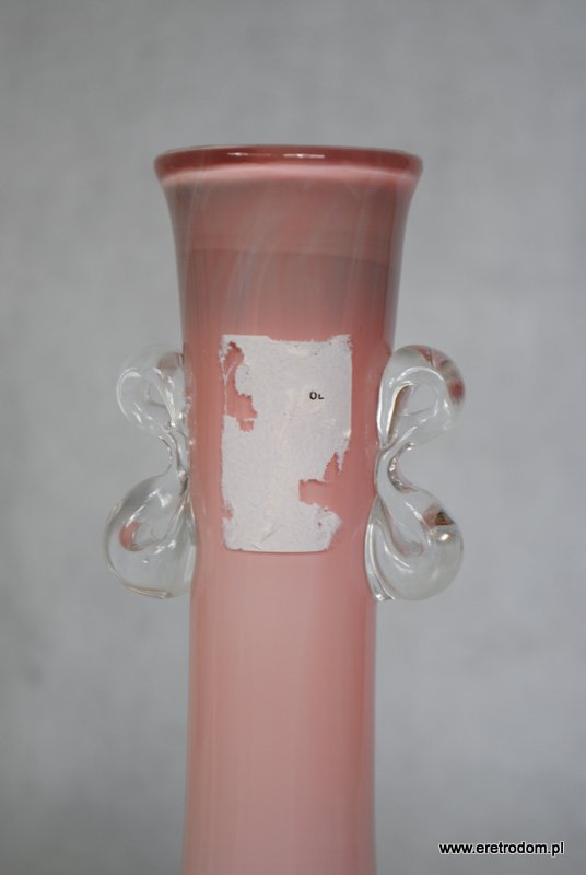 Wazon, projekt Jerzego Słuczana-Orkusza dla Huty Szkła Tarnowiec. Szkło sodowe, barwione w masie, cieniowane, ze smugami. Po bokach dwie bezbarwne kokardki. Posiada pozostałość po naklejce producenta.