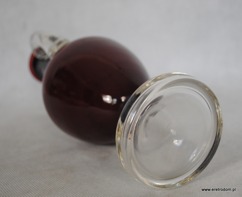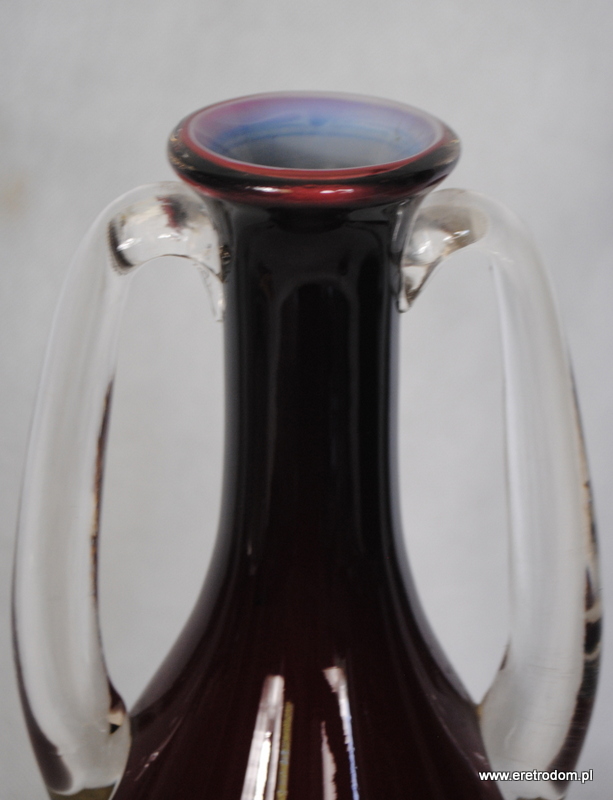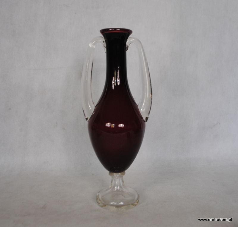 Wazon wypudrowany w Hucie Szkła Tarnowiec. Szkło sodowe, ręcznie formowane, barwione w masie na rubinowy kolor. Wnętrze wazonu w mlecznych odcieniach. Uszy oraz noga bezbarwne.