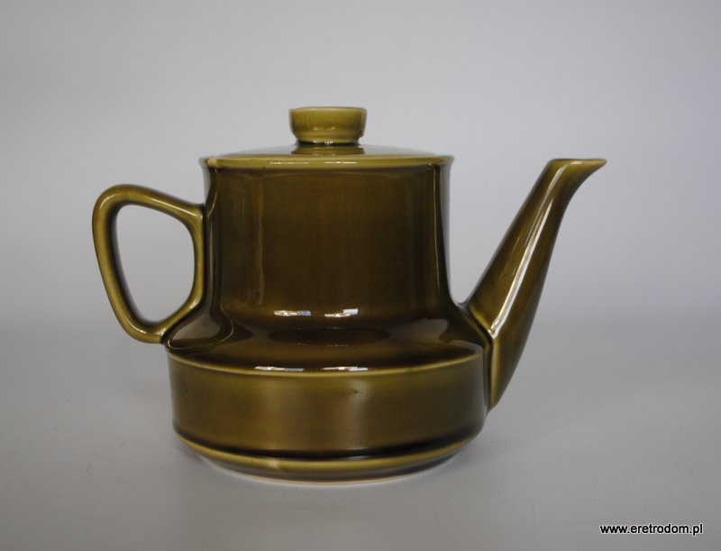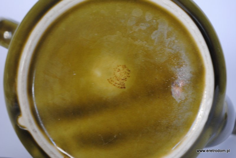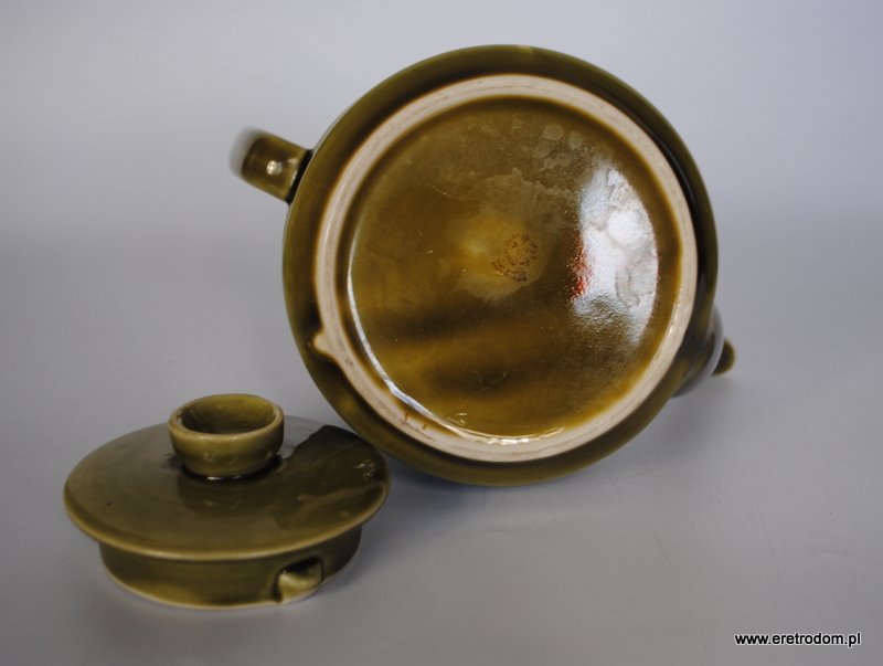 Imbryk sygnowany Tułowic. Porcelit szkliwiony na kolor oliwkowy.