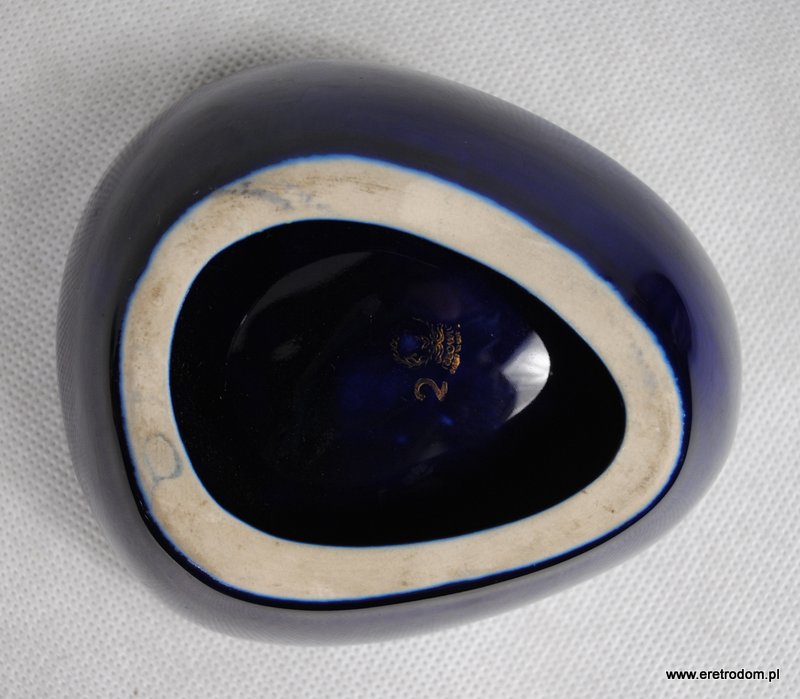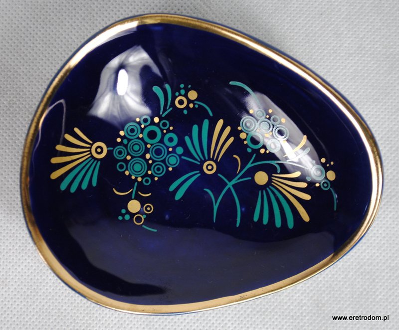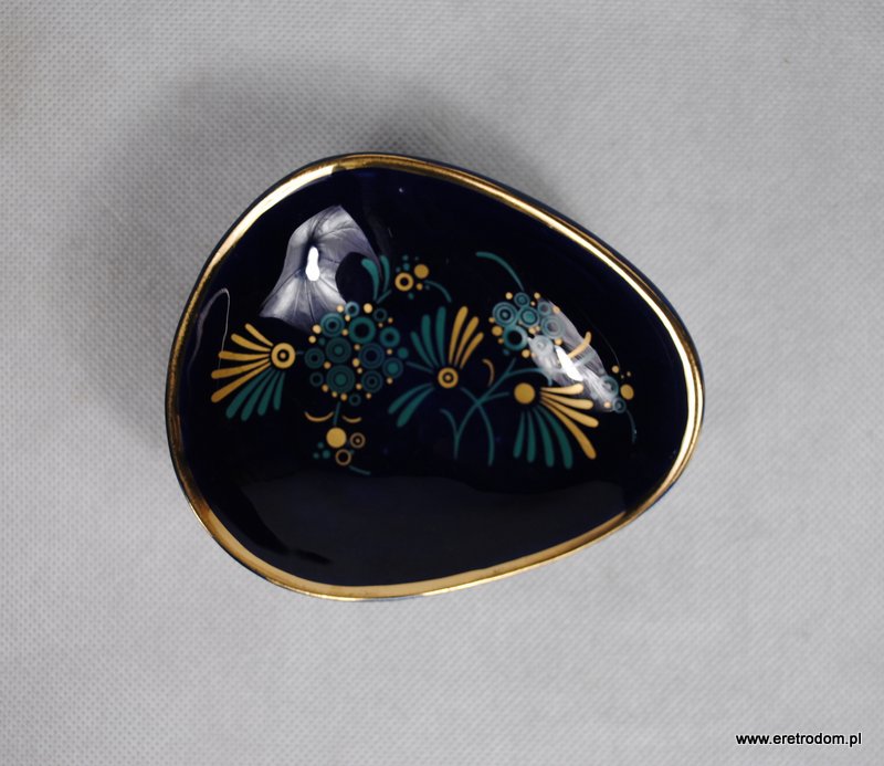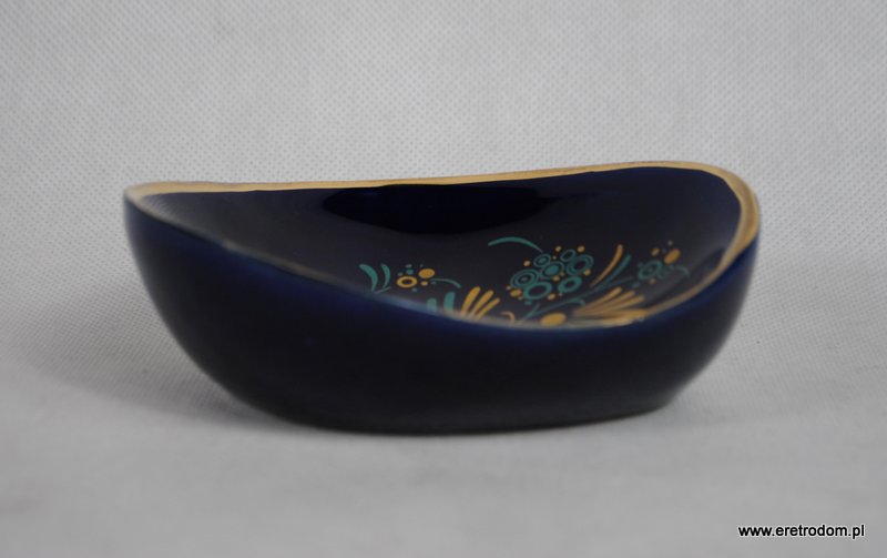 Popielniczka sygnowana Tułowice. Ceramika szkliwiona na ładny kobaltowy kolor, zdobiona kwiatami w złotym kolorze.