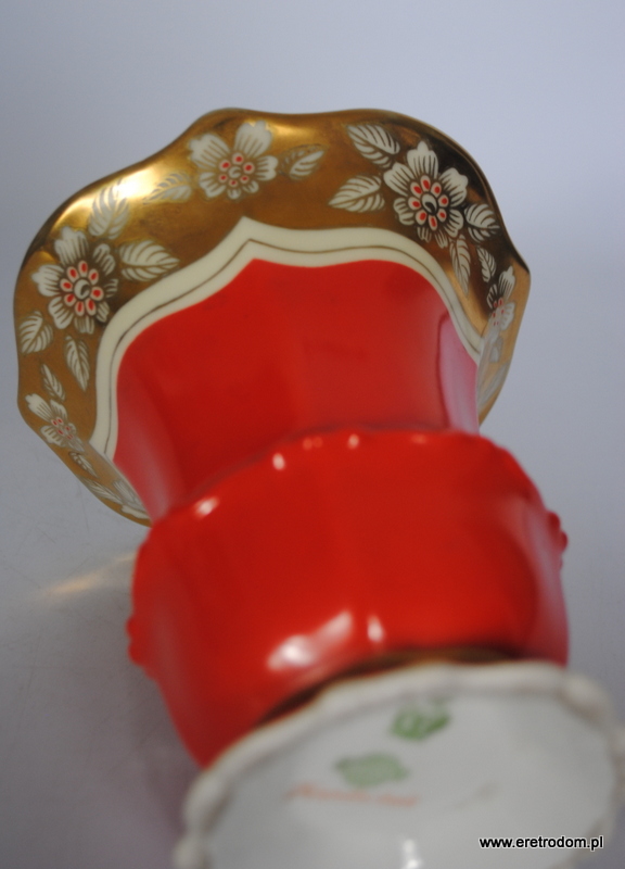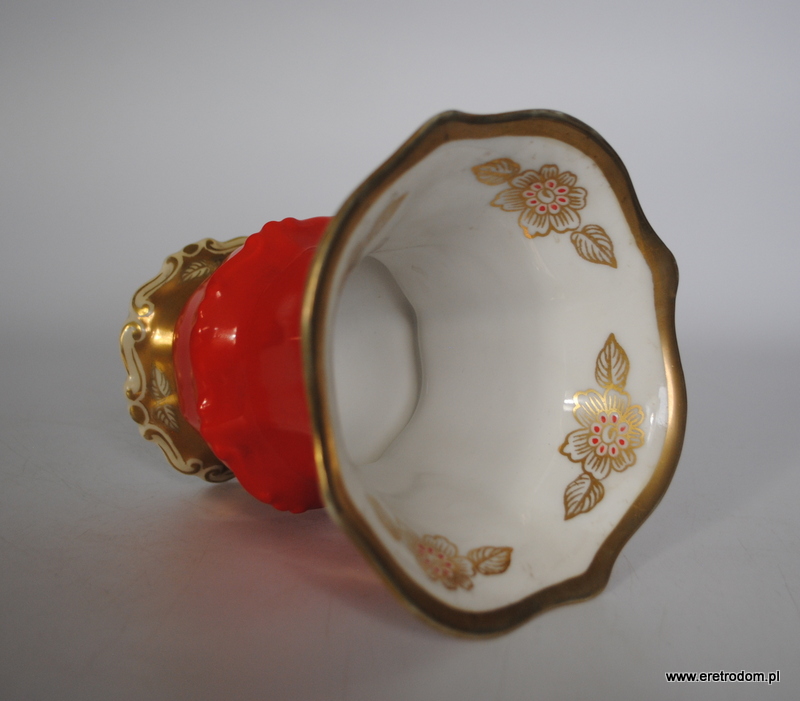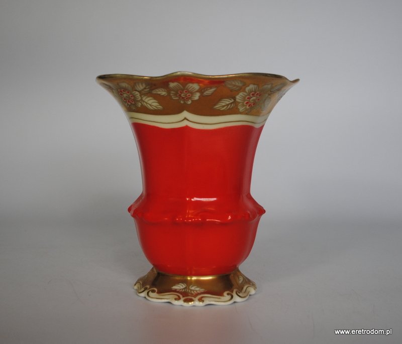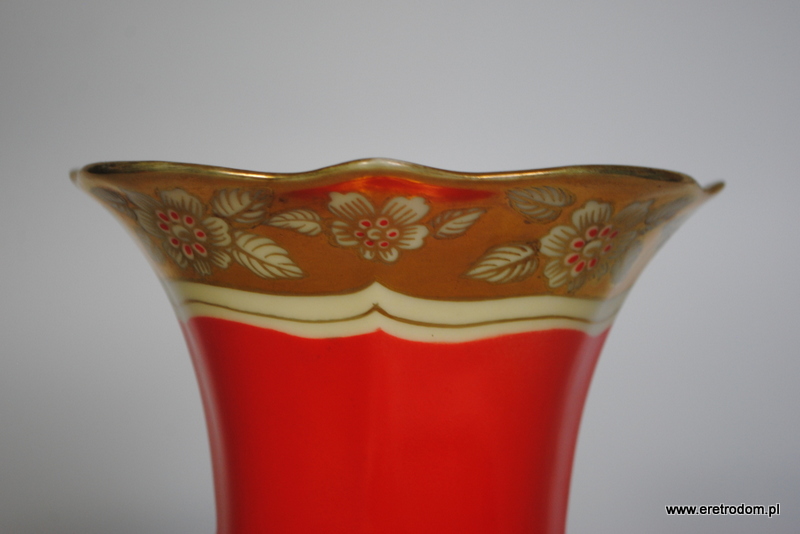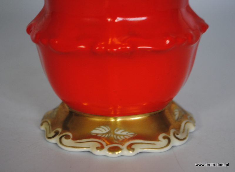 Wazon sygnowany Tillowitz Epos ( Początek XXw.). Biała porcelana ręcznie malowana na czerwony kolor, bogato złocona.