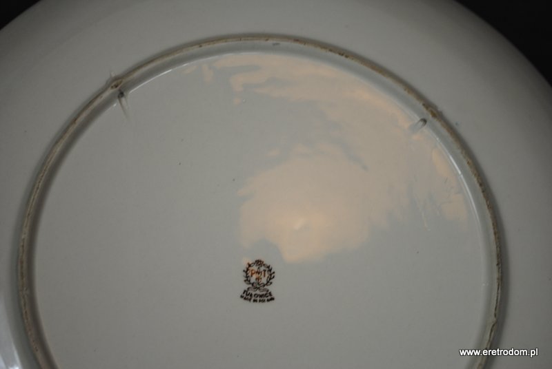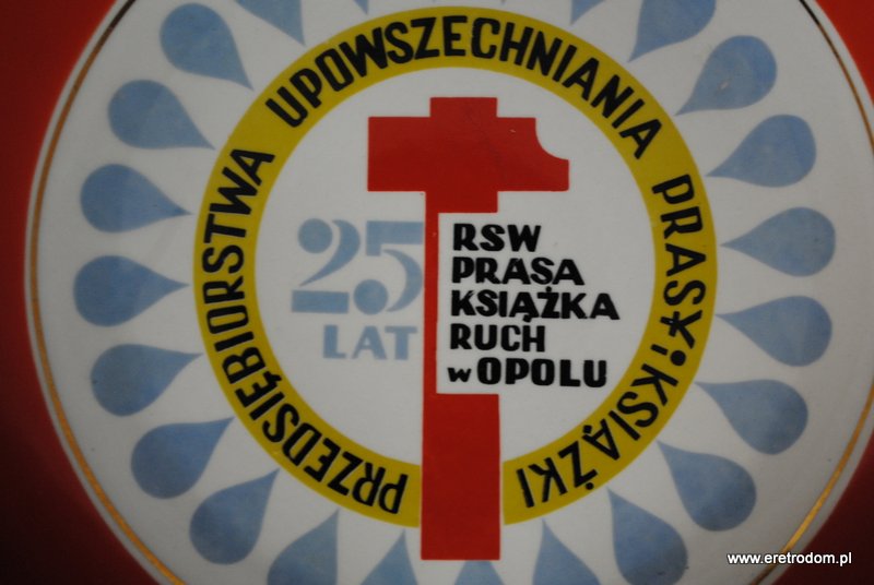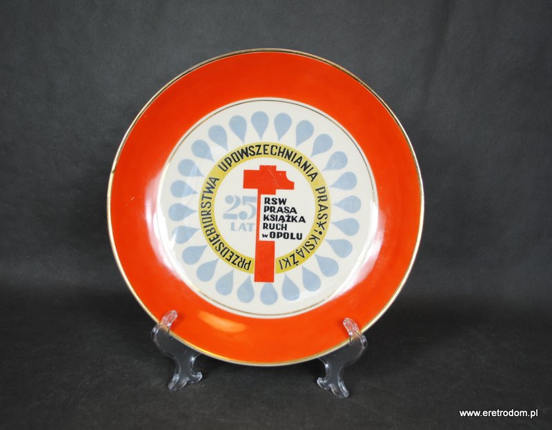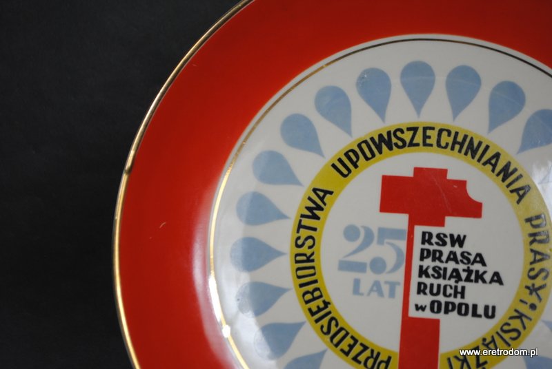 Talerz ozdobny sygnowany Tułowice. Wykonana z okazji 25 lecia Przedsiębiorstwa Upowszechniania Prasy i Książki. Ruch Opole. Porcelit malowany natryskowo.