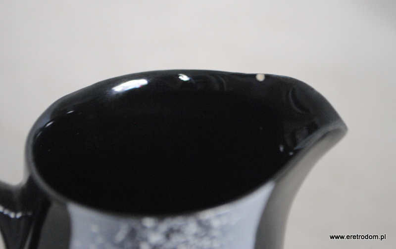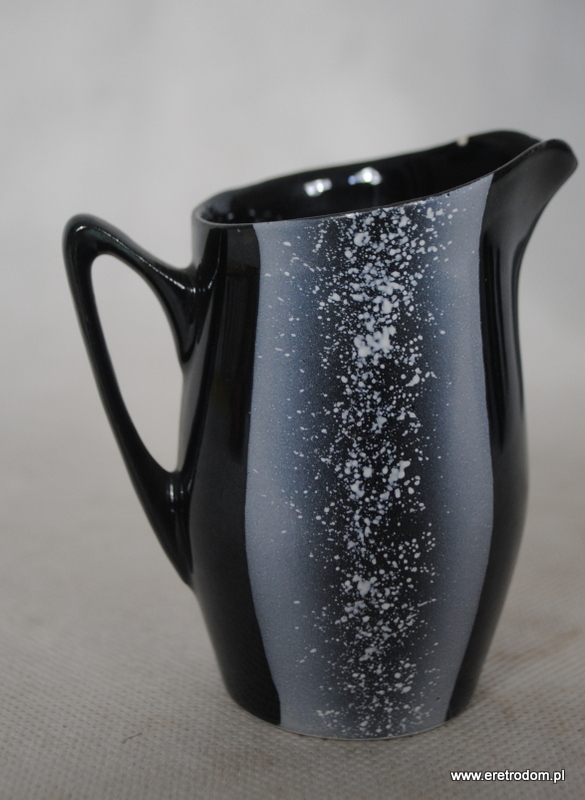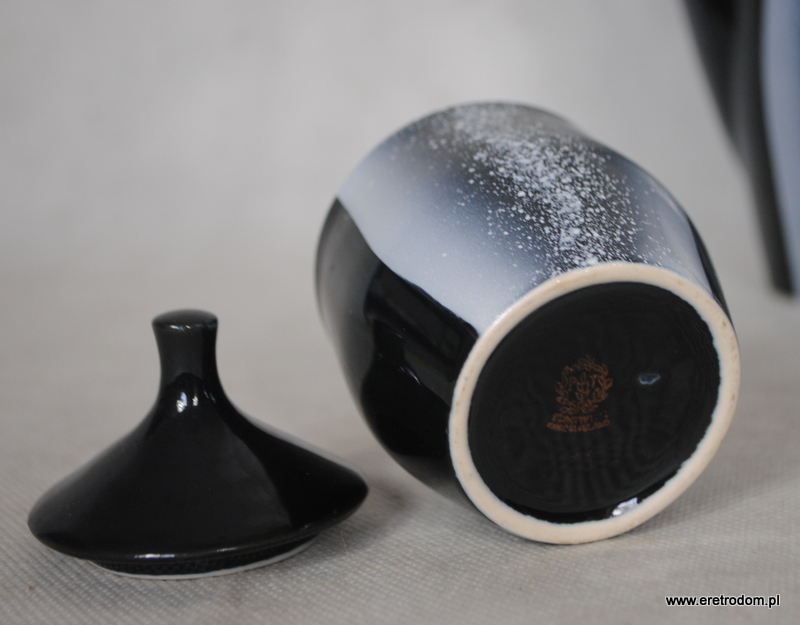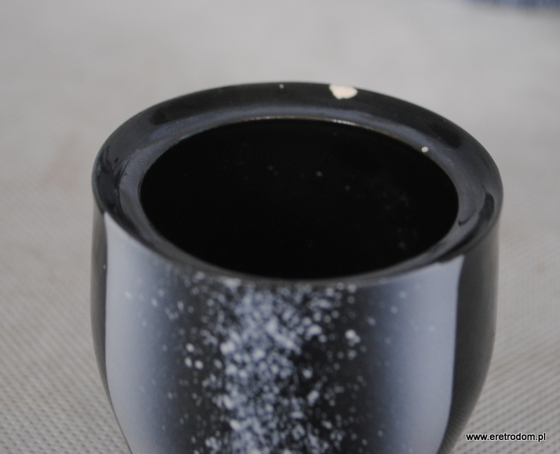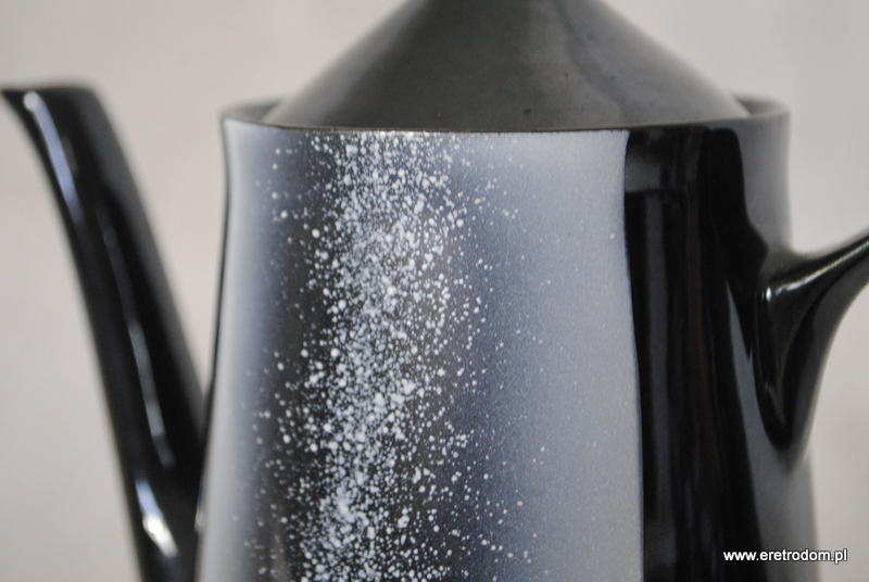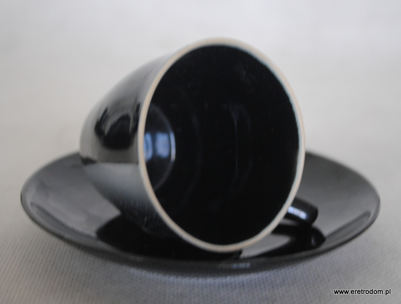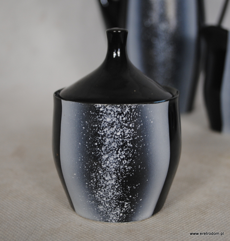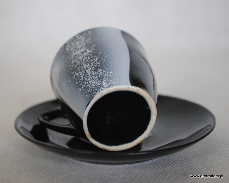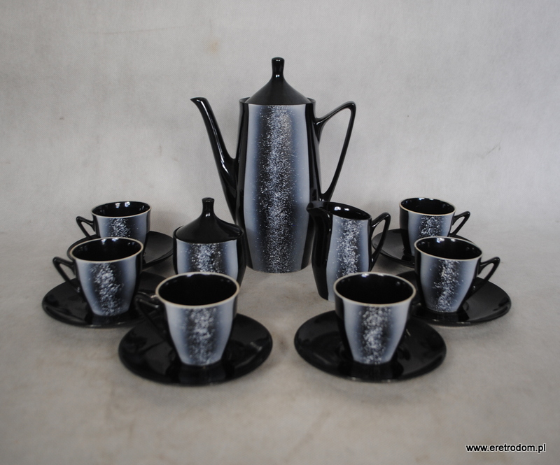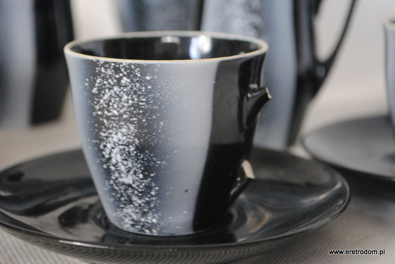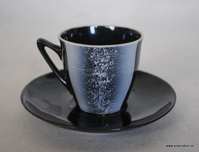 Zestaw do mokki dla 6 osób. Produkcja Tułowice, fason Opole (proj. Kowalscy). Porcelit malowany na czarno, zdobienie nazywane „gwiezdny pył”.