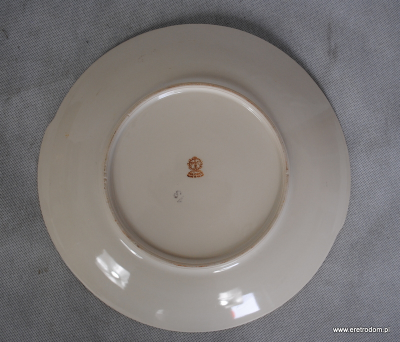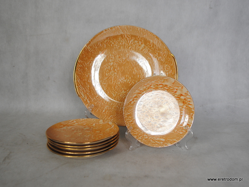 Zestaw deserowy sygnowany Tułowice. Kobalt zdobiony złotymi listkami. W skład zestawu wchodzi jeden duży talerz na ciasto oraz 6 deserowych.