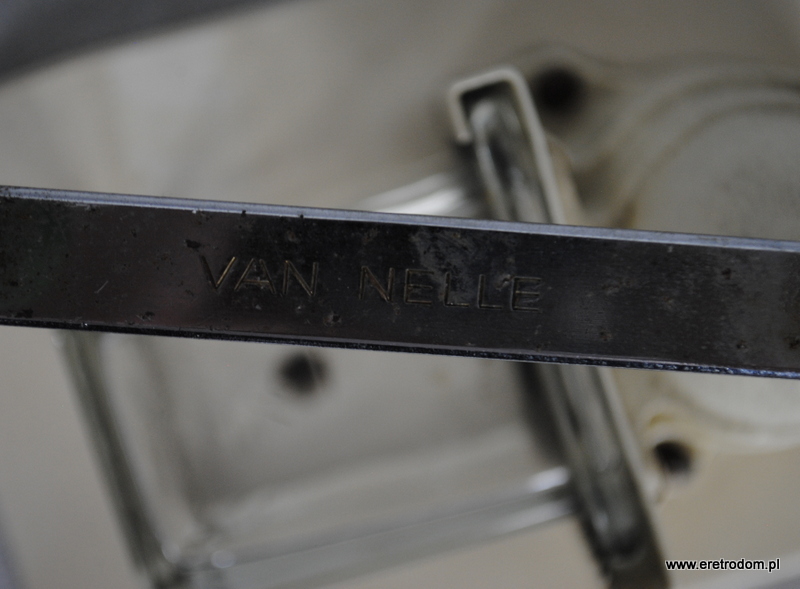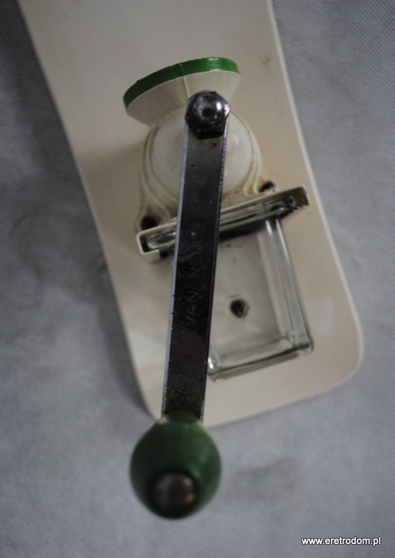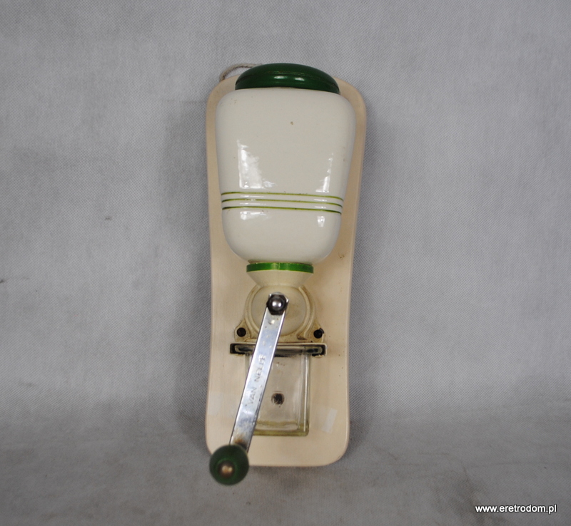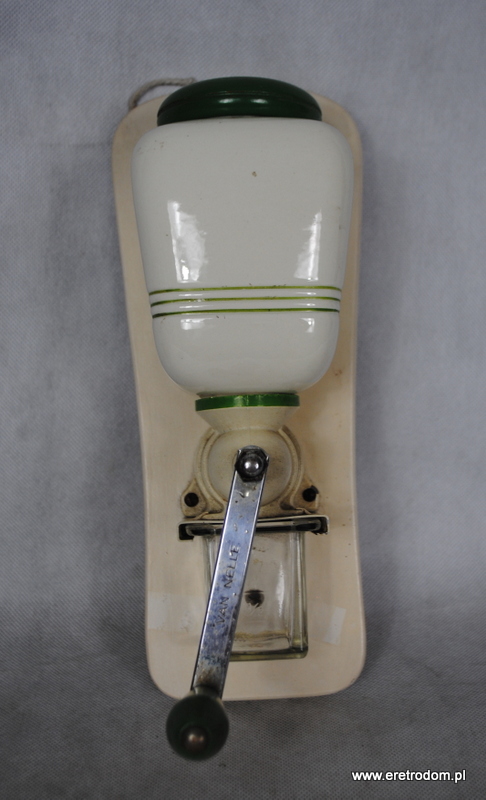 Młynek do kawy wyprodukowany w I poł XXw. przez firmę Van Nelle. Ceramiczny pojemnik na kawę w kolorze śmietanki, malowany zieloną kreską. Całość osadzona na desce.