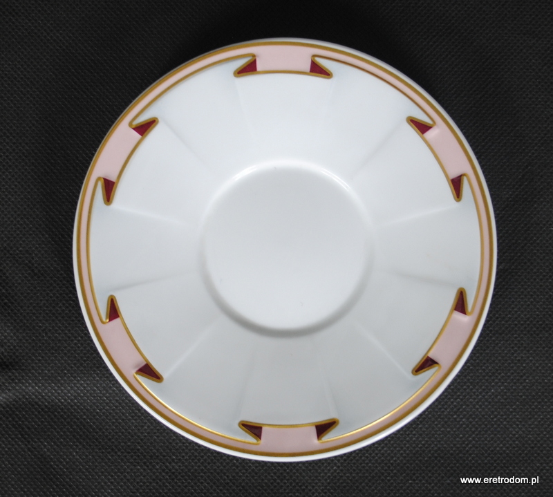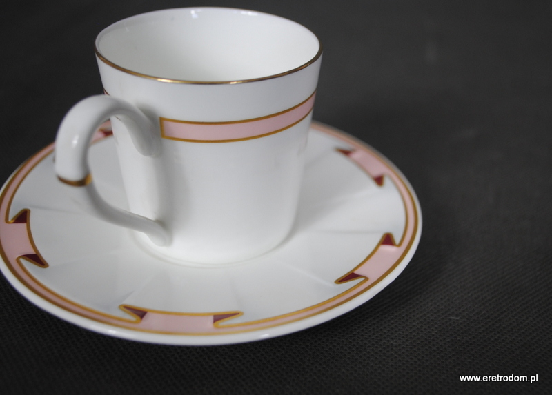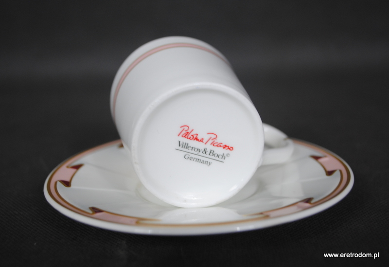 Filiżanka ze spodkiem, mokka sygnowana Villeroy & Boch ( Paloma Picasso). Biała, delikatna porcelana ozdobiona brzoskwiniowymi i złotymi akcentami.