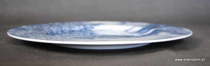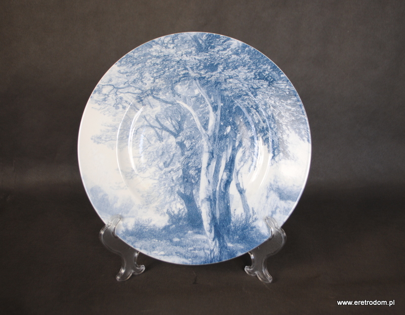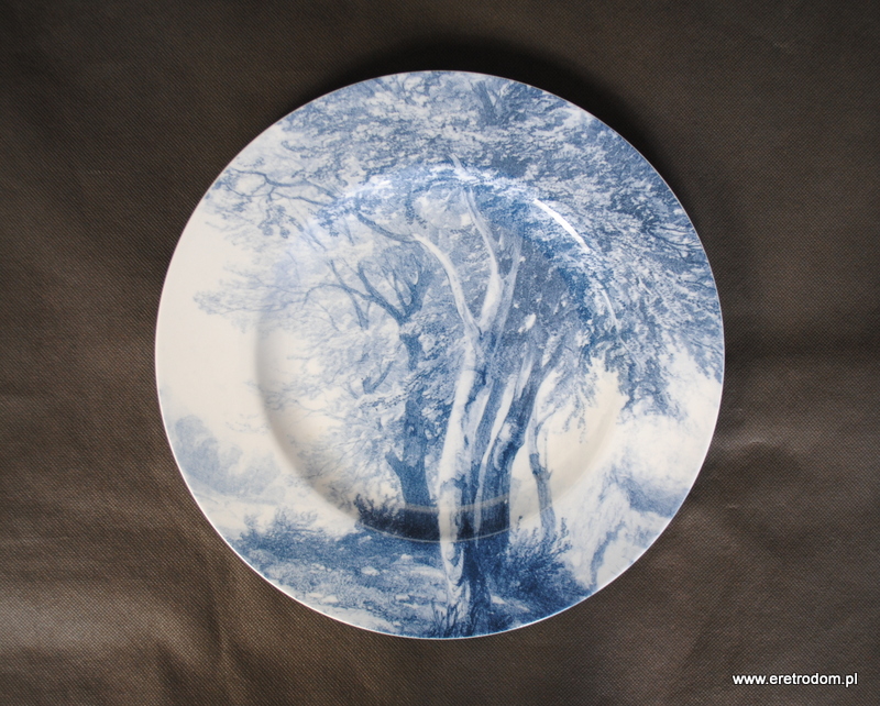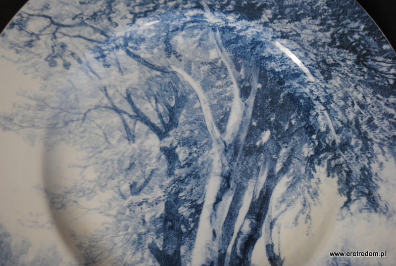 Talerz dekoracyjny sygnowany Villeroy&Boch. Biała, delikatna porcelana ozdobiona motywem drzew w niebieskich kolorach.