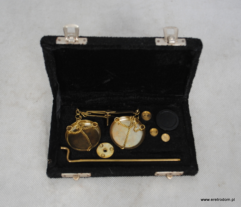 Waga jubilerska wykonana z mosiądzu. Dodatkowo zestaw ciężarków. Całość w oryginalnym etui.