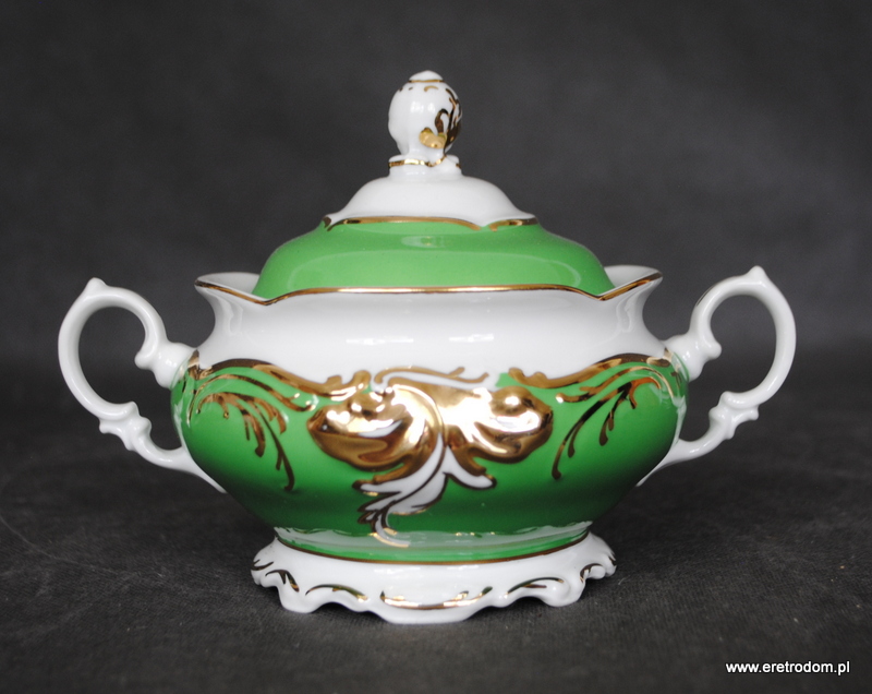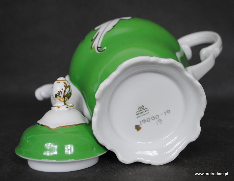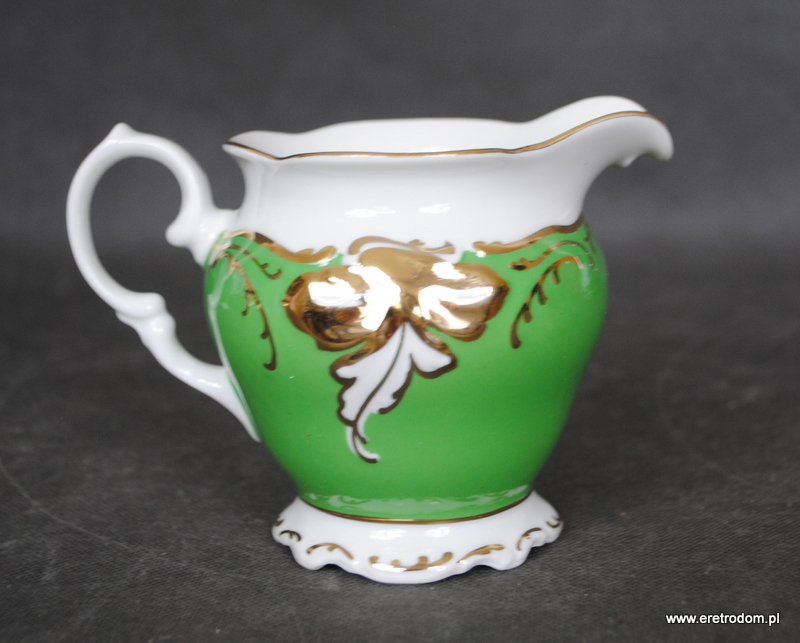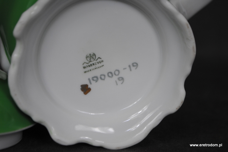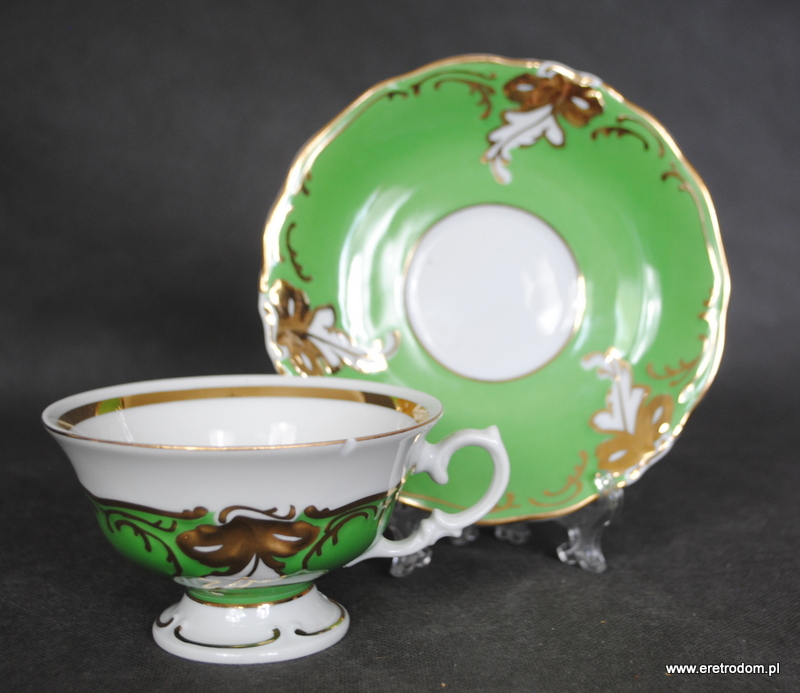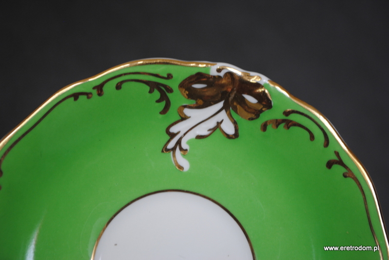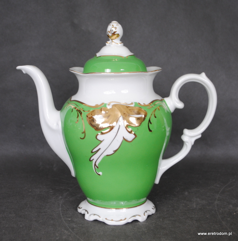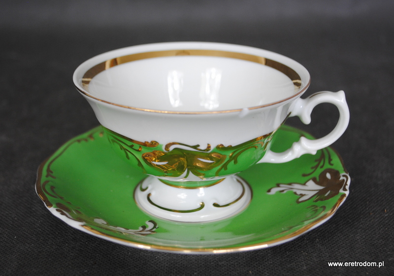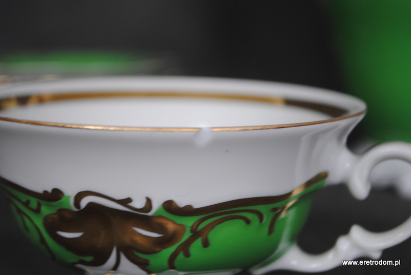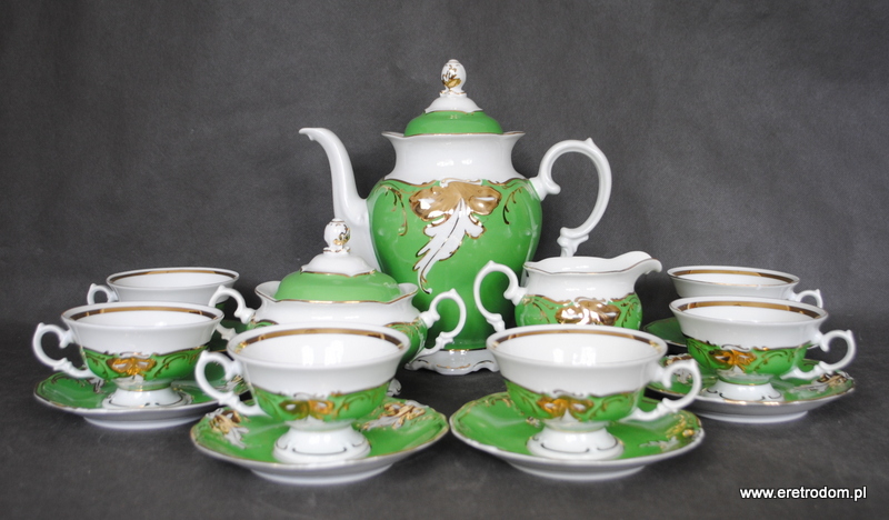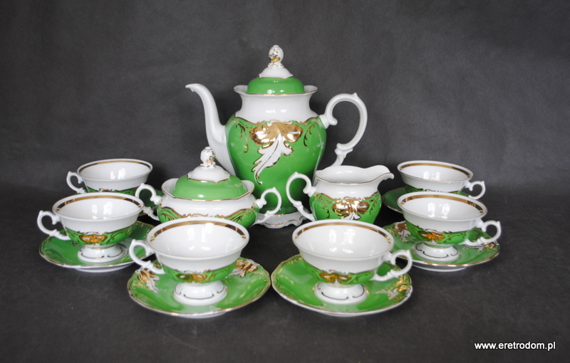 Zestaw do kawy dla 6 osób. Wyprodukowany w Wałbrzychu w II poł. XXw. . Fason Fryderyka. Biała porcelana malowana na zielono, złocona.