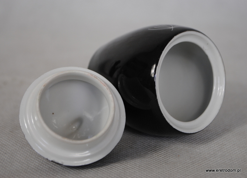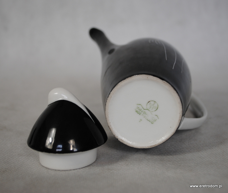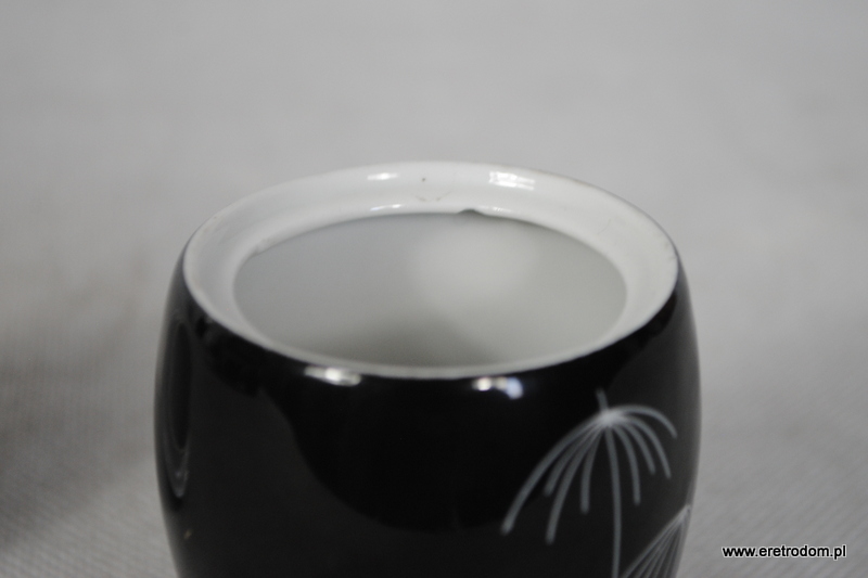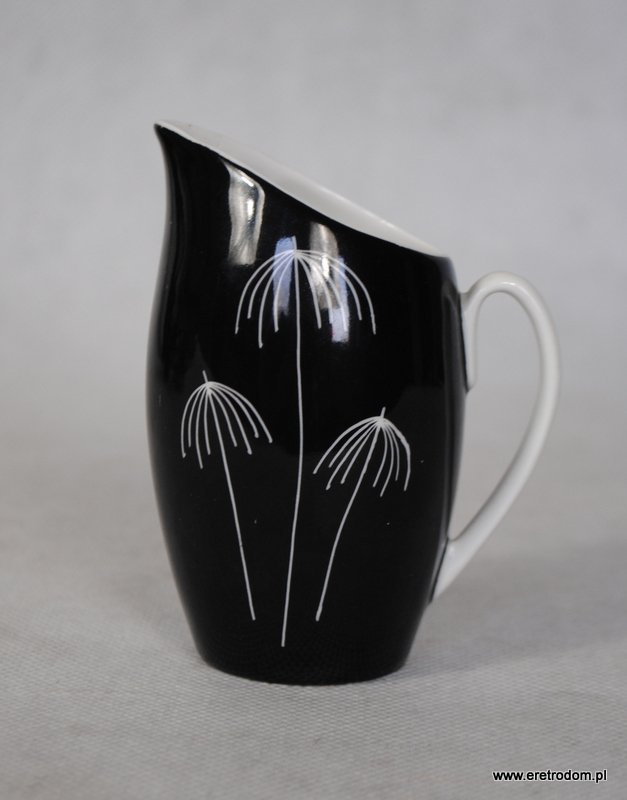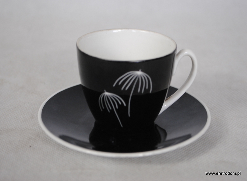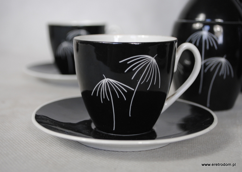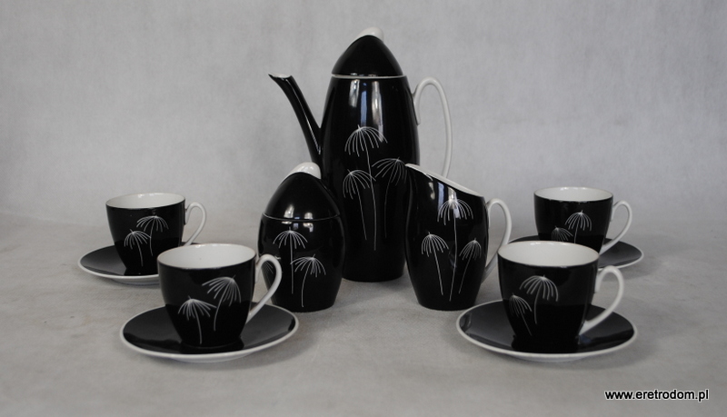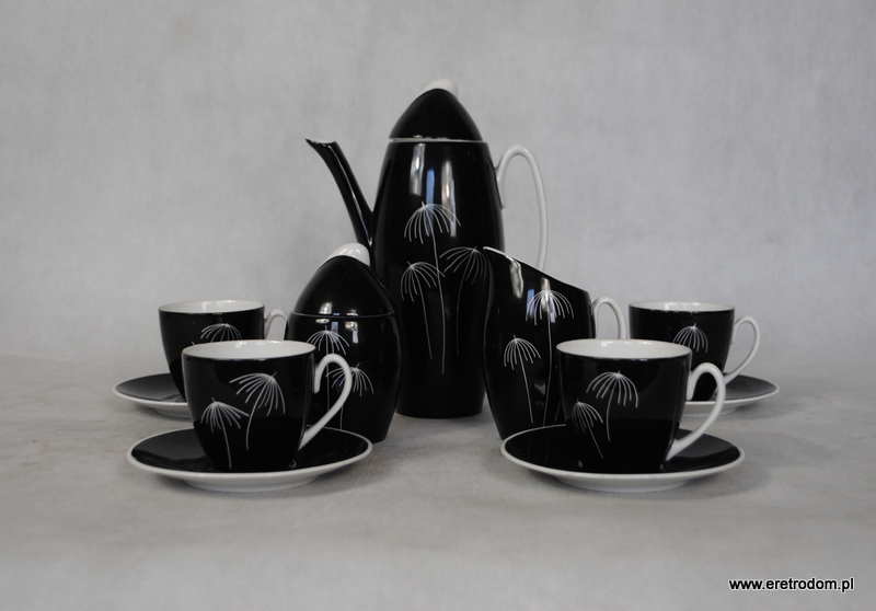 Serwis do kawy dla 4 osób sygnowany Wałbrzych. Fason Tom projektu J. Steckiewicza z 1958 roku. Biała, delikatna porcelana malowana natryskowo na czarny kolor, natrysk wybieramy w stylu New Look.