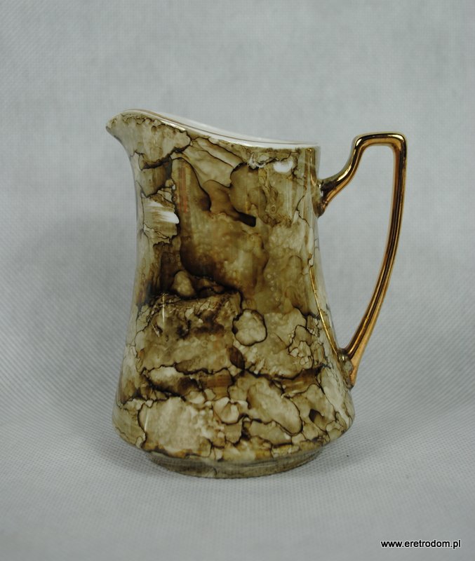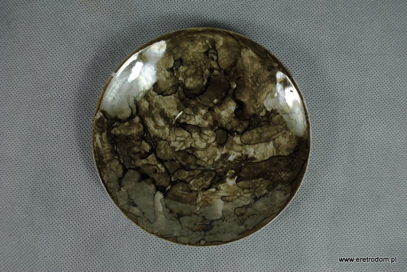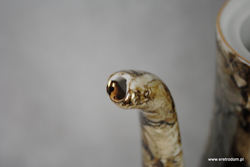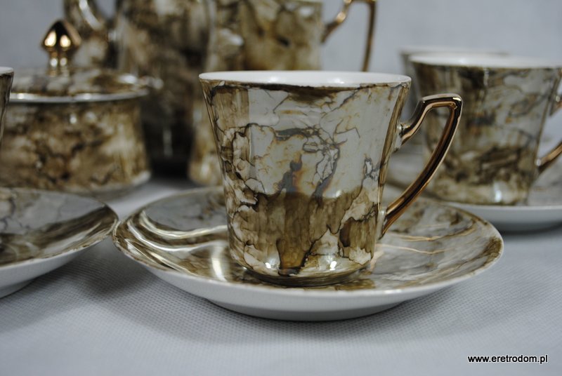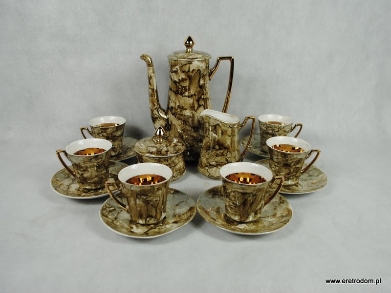 Wyjątkowej urody serwis do kawy sygnowany Wałbrzych, lata 60-70. Zestaw dla 6 osób. Malowany w tzw. marmurek w odcieniu brązowym, lekko przełamanym szarym kolorem. Środek filiżanek złocony. Całość prezentuje się bardzo ładnie.