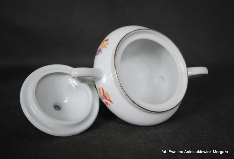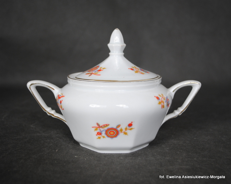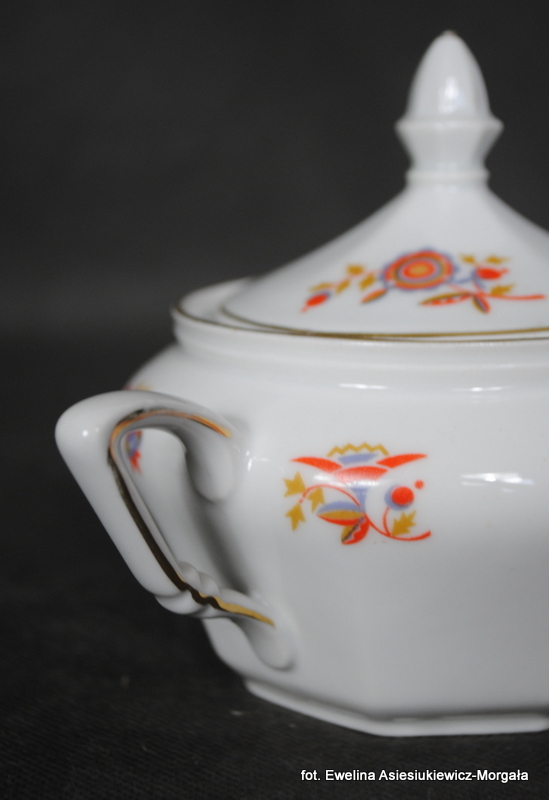 Cukiernica sygnowana Carl Tielsch ( Wałbrzych, Stary Zdrój, I poł. XXw.). Biała porcelana ozdobiona geometryczną kalką kwiatową.