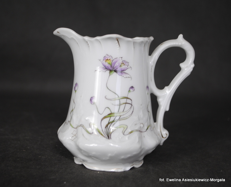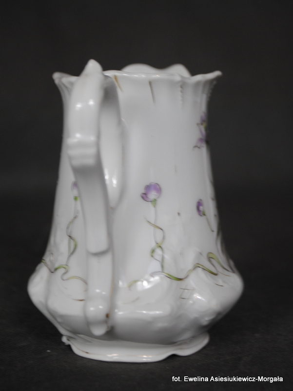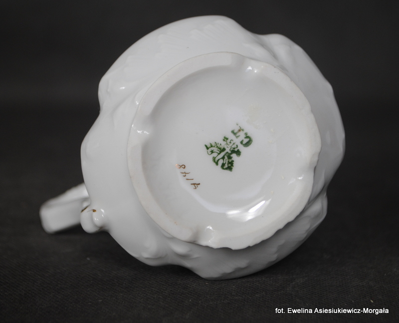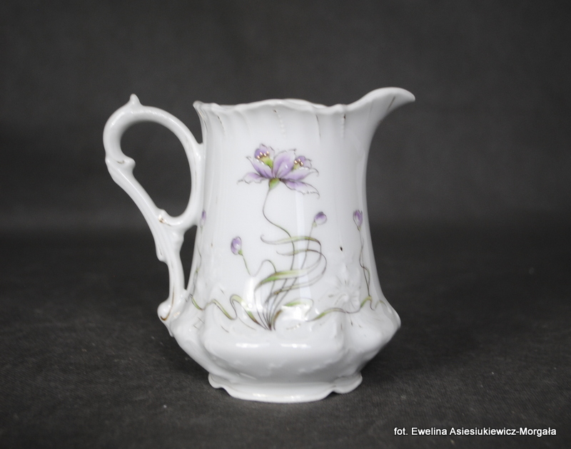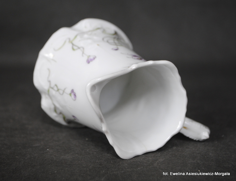 Mlecznik sygnowany Carl Tielsch (Wałbrzych, Stary Zdrój, I poł. XXw.). Biała porcelana ozdobiona kalką kwiatową.