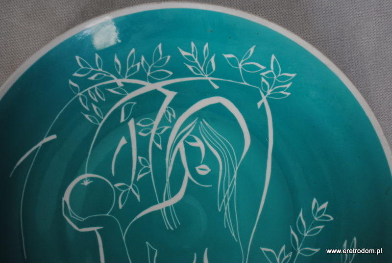 Patera sygnowana Wałbrzych. Przedstawia biblijną Ewę trzymającą jabłko. Wykonana w latach 60 XXw. Biała porcelana malowana natryskowo, wybierana. Dekoracja w styku New Look.
