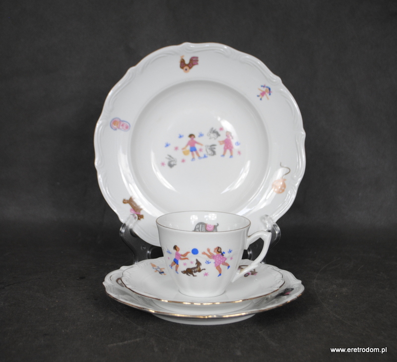 Dziecięcy zestaw śniadaniowy sygnowany Wałbrzych (II poł XXw.). Biała porcelana ozdobiona zabawką kalką. W skład zestawu wchodzą filiżanka ze spodkiem, talerzyk deserowy, i talerz głęboki.