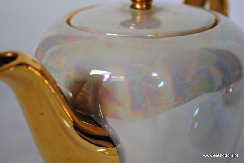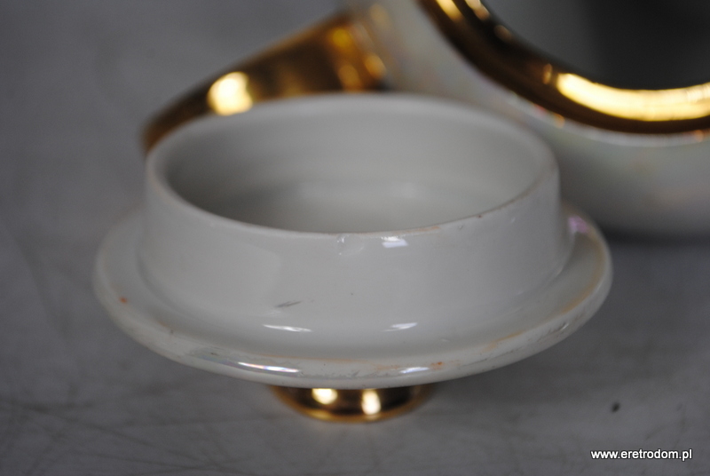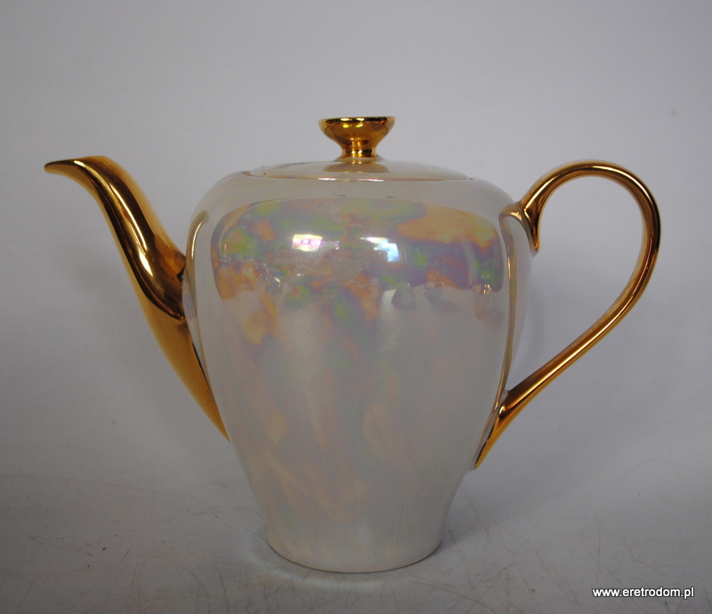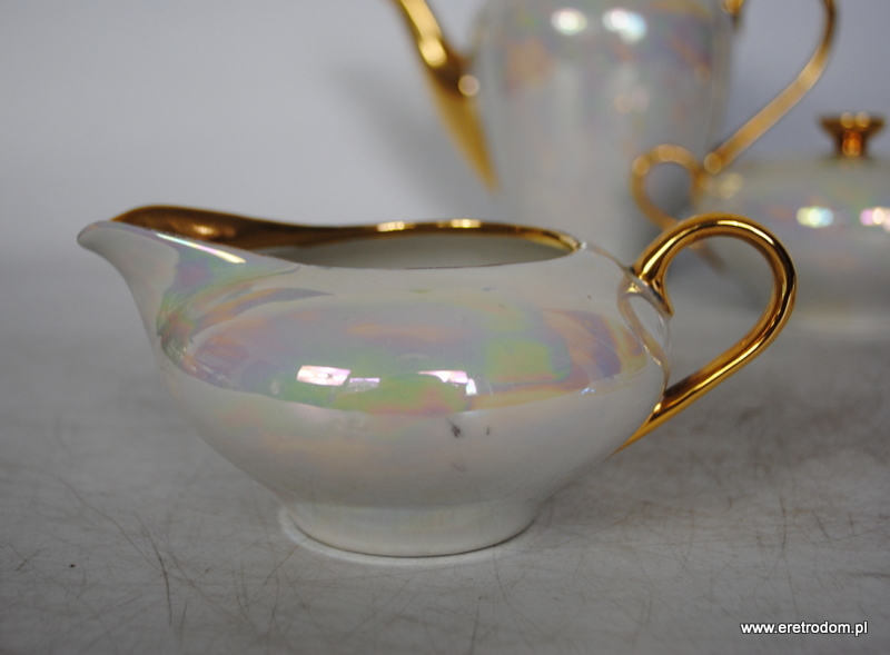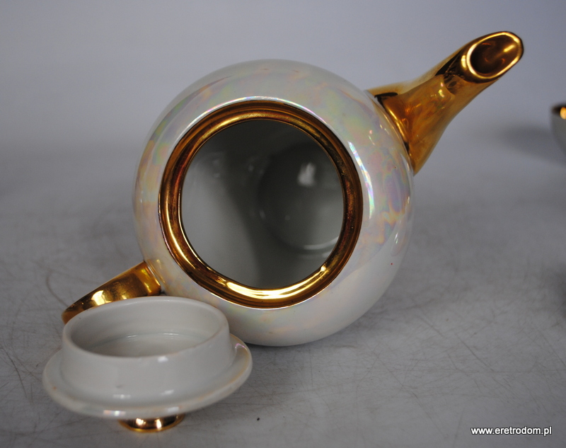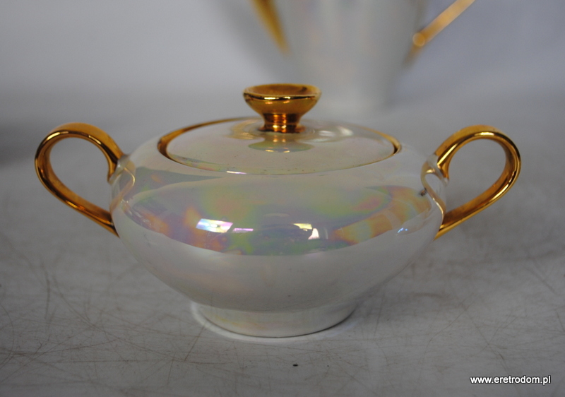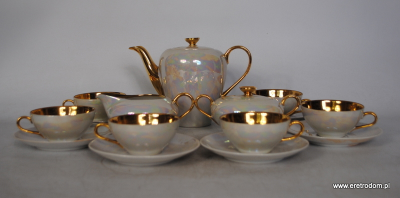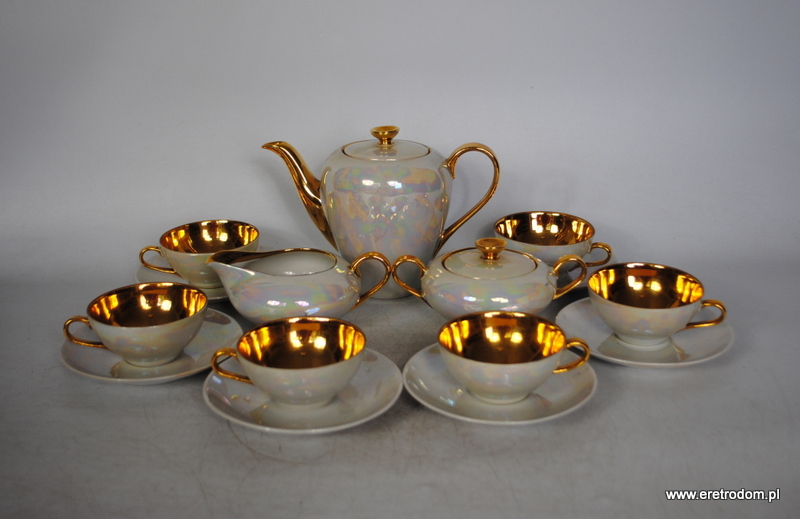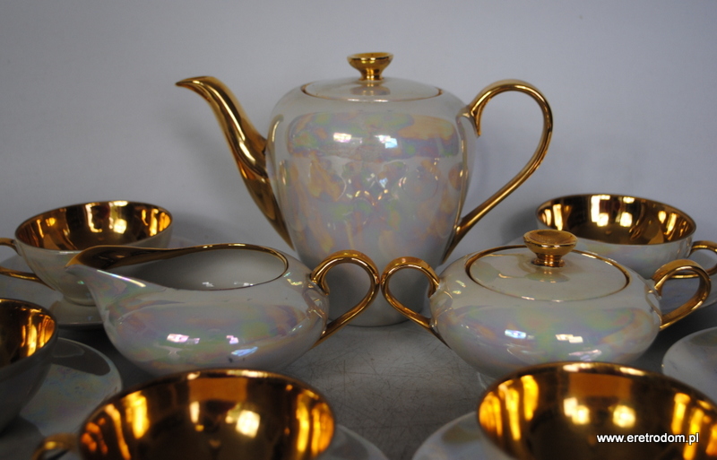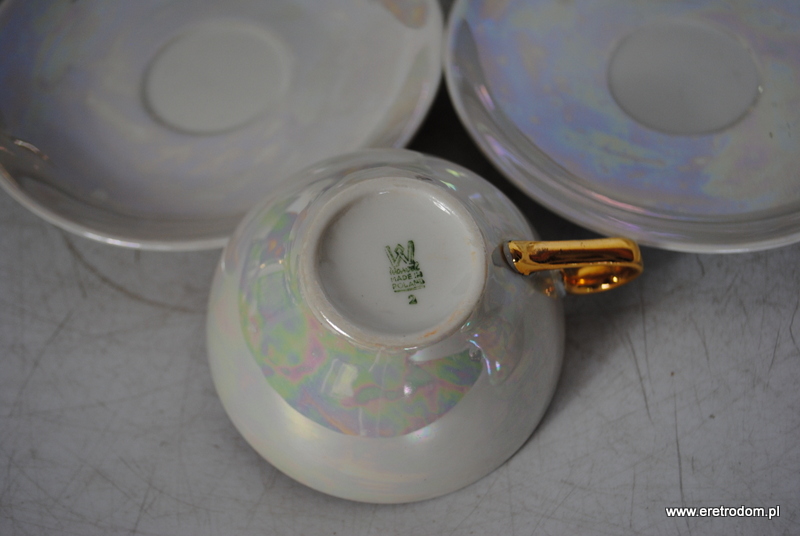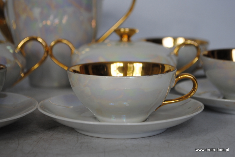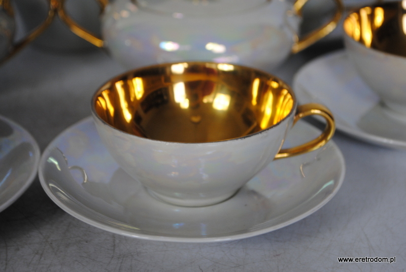 Zestaw do mokki sygnowany Wawel. II poł. XXw. Delikatna porcelana, iryzowana, filiżanki w pełnym złoceniu. Komplet dla 6 osób.