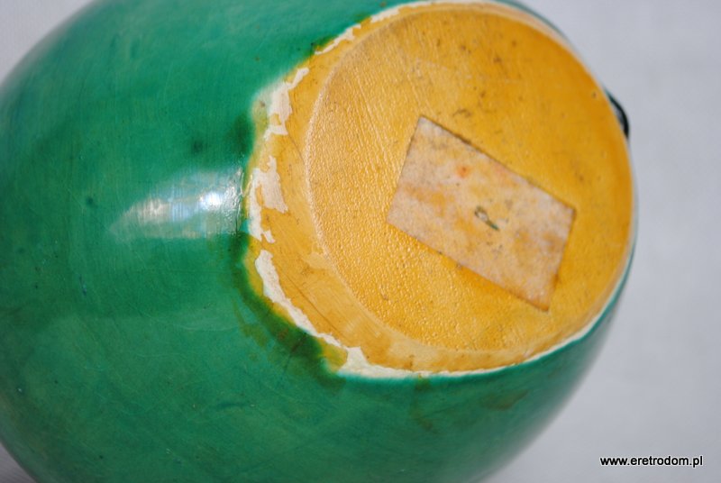 Wazon, produkcja Spółdzielnia Białystok. Ceramika szkliwiona na kolor zielony. Od spodu kartka producenta, niestety już nieczytelna.
