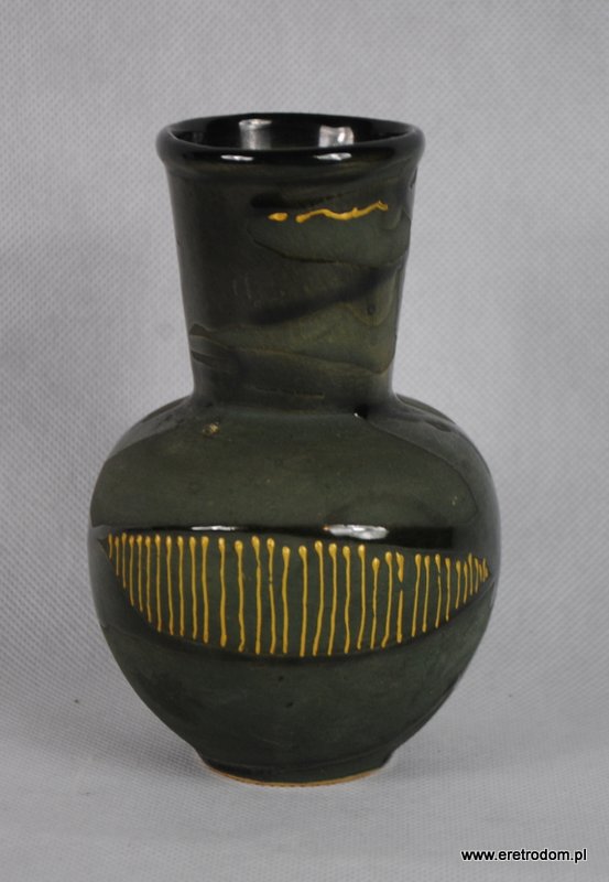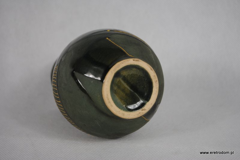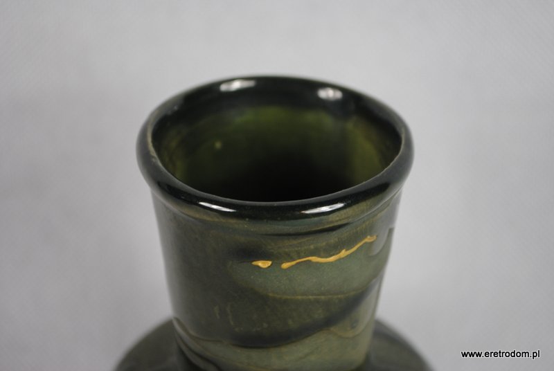Wazon wykonany z ceramiki w kolorze ciemnej zieleni z dodatkiem złota. Częściowo szkliwiony.