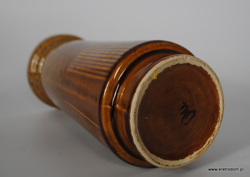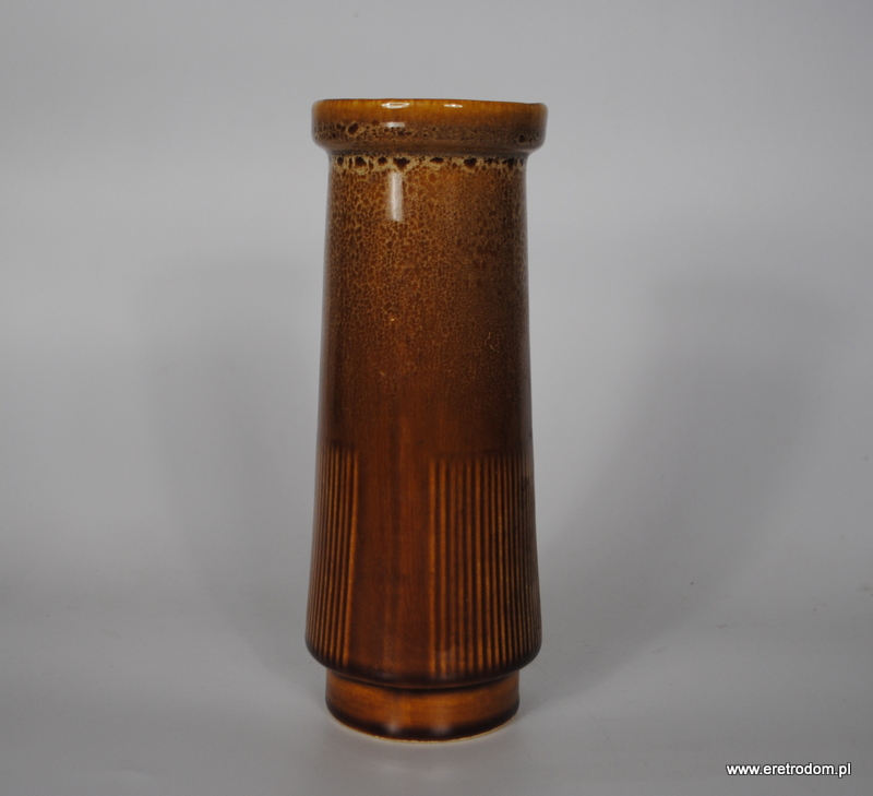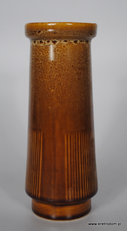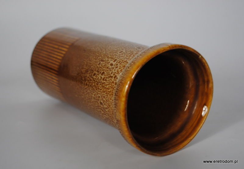 Wazon wyprodukowany w Mirostowickie Zakłady Ceramiczne, oznaczony symbolem W-125. Wykonany z porcelitu szkliwionego, w górnej części wazonu charakterystyczny dla Mirostowickich produktów grysik, nakrapiany wzór.