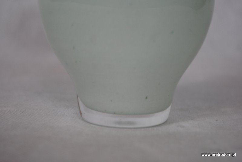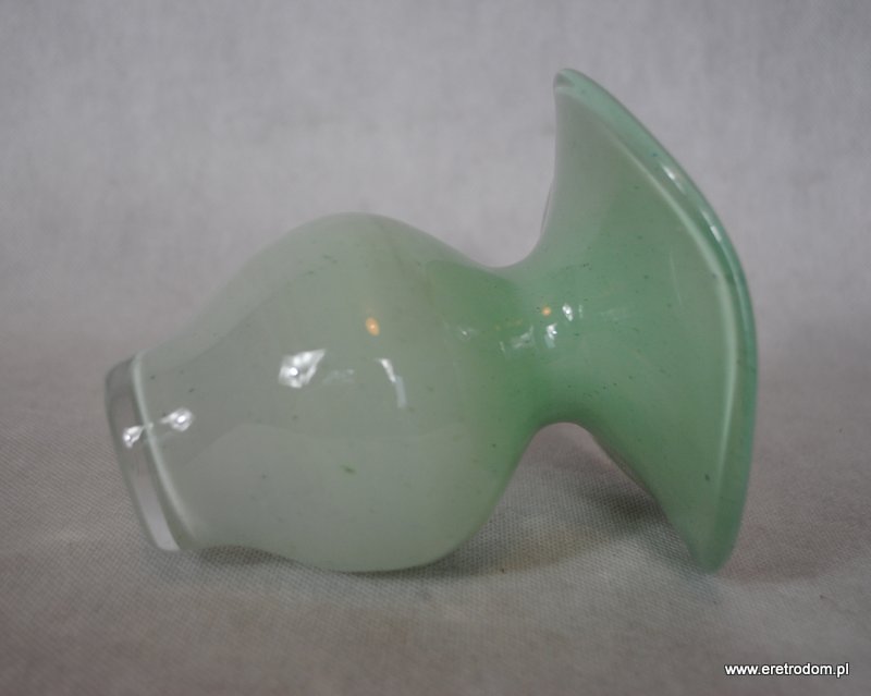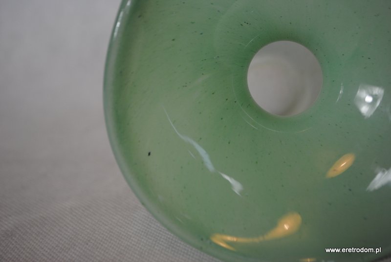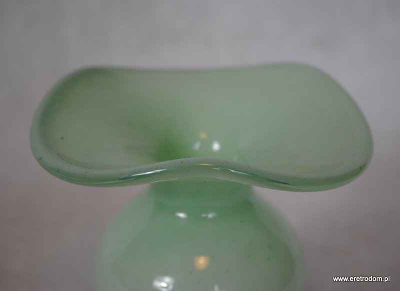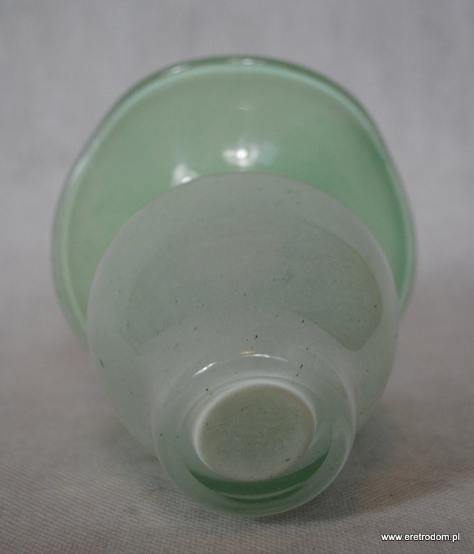 Wazon, szkło sodowe, barwione w masie w odcieniach zieleni/mięty. W masie zatopione są drobinki. Najprawdopodobniej polska produkcja z lat 70-80 XXw.