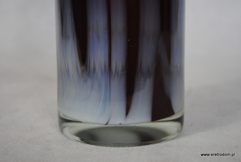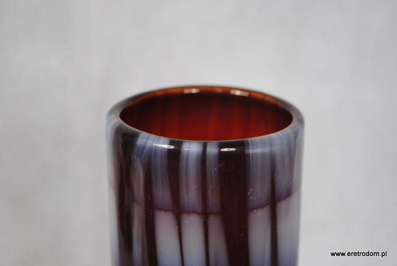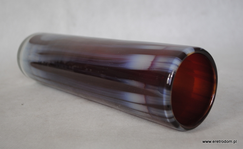 Wazon „Tuba”, Guta Szkła Tarnowiec. Projekt Jerzego Słuczana-Orkusza. Grube szkło sodowe, barwione w masie na kolor burgundowo- fioletowy, posiada jasne, mleczne smugi.