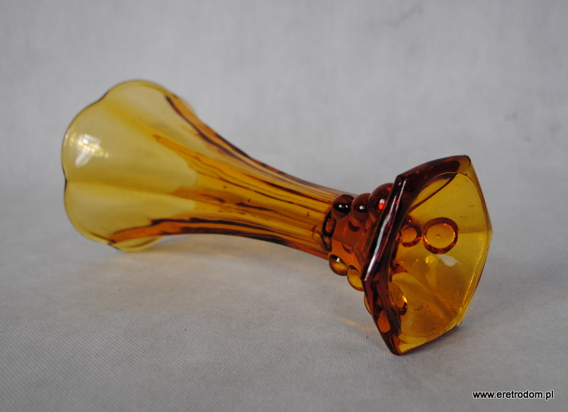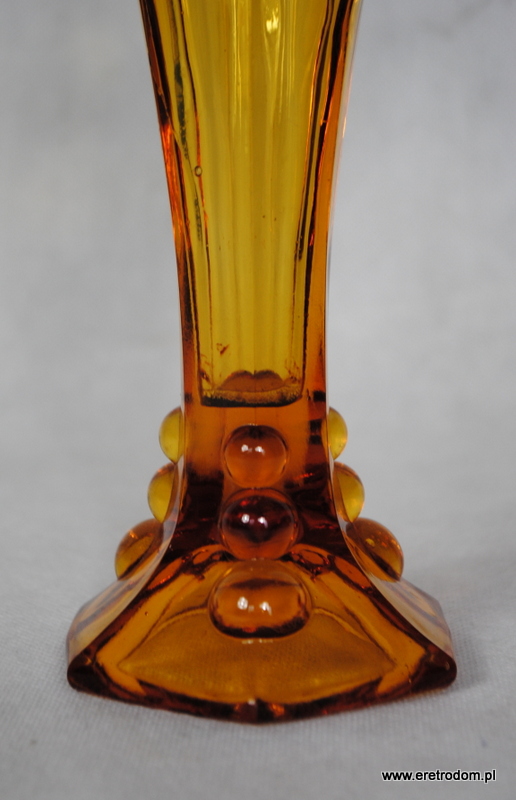 Wazon szklany w stylu Art Deco. Szkło sodowe, prasowane, barwione w masie. Bardzo ładna forma, przy stopie zdobiona kulkami.