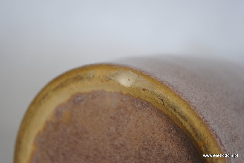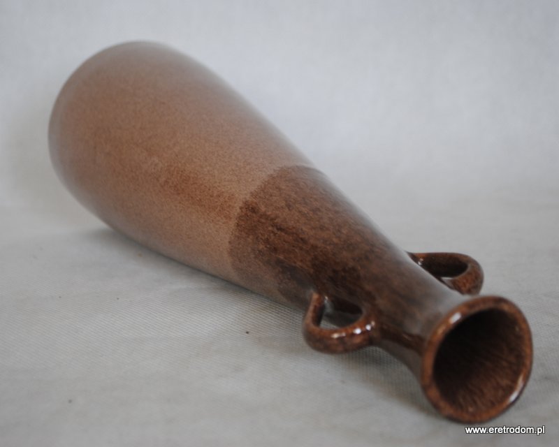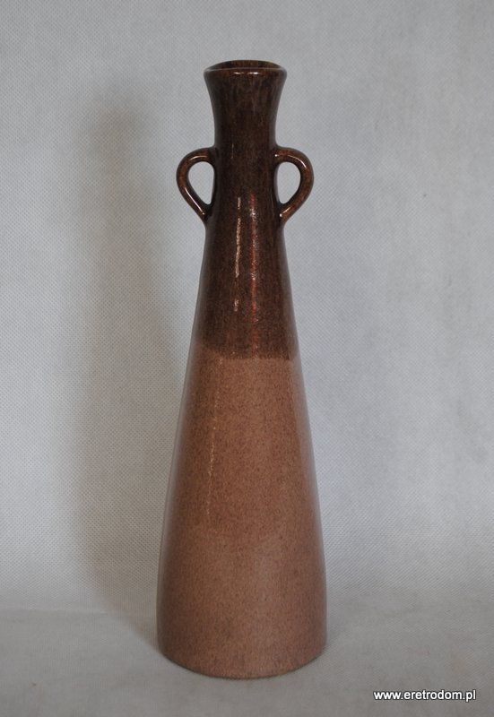Smukły wazon z uszami, lata 60-70 XXw. Ceramika szkliwiona w odcieniach brązu, po bokach niewielkie symetrycznie ułożone uszy.