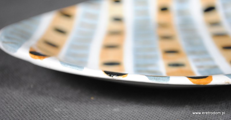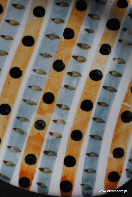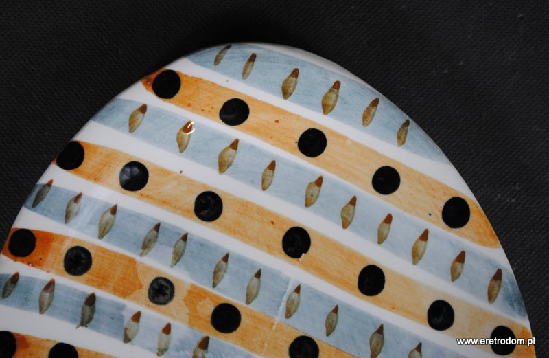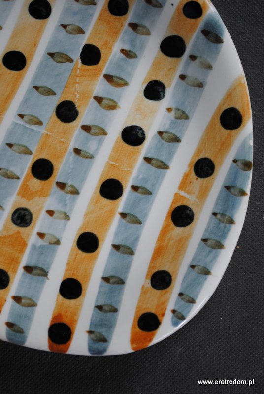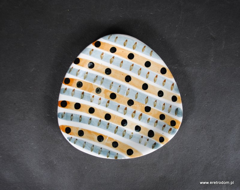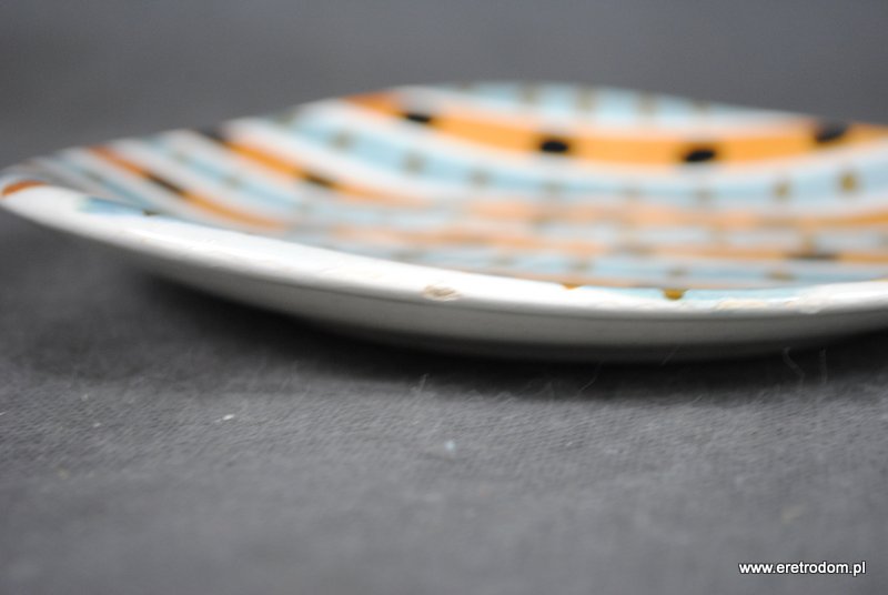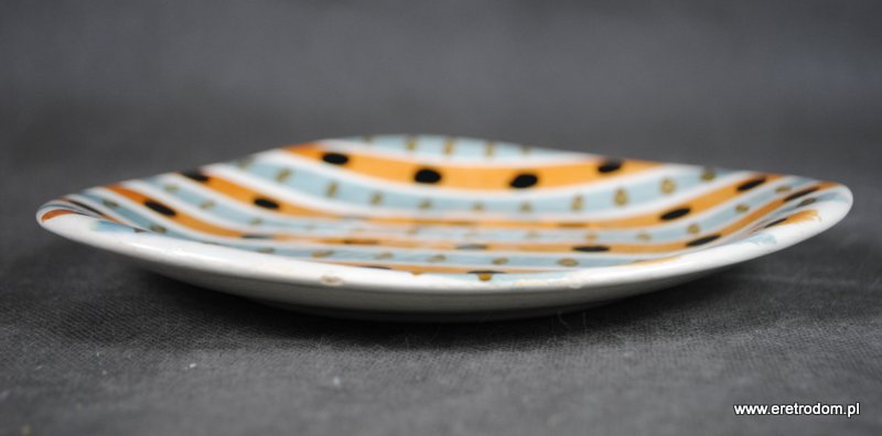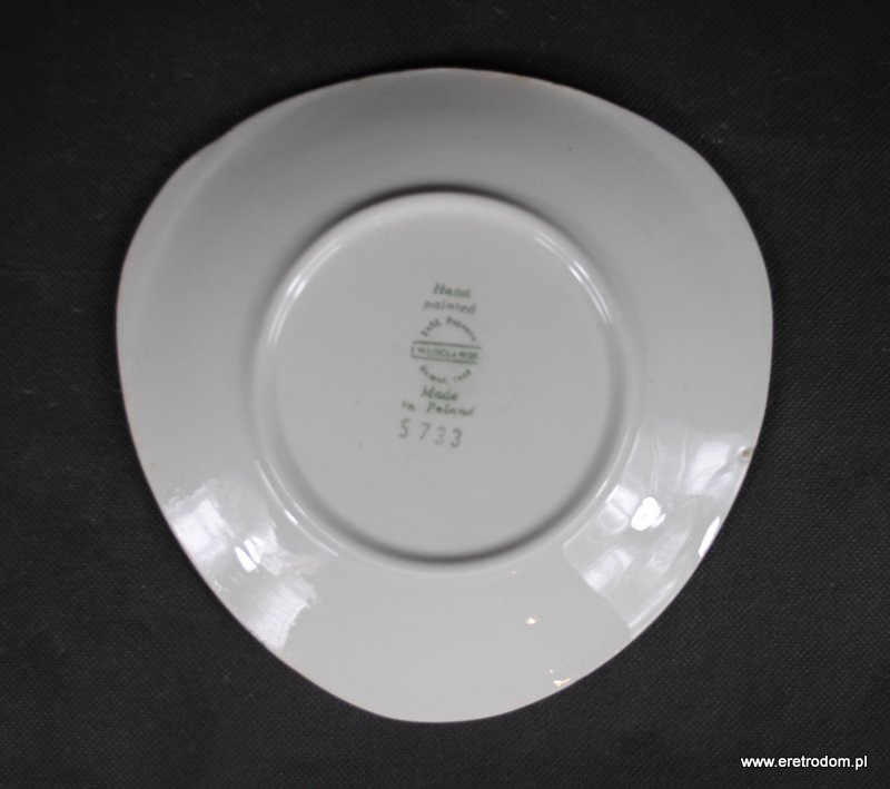Talerzyk sygnowany Włocławek. Proj. Elżbieta Piwek-Białoborska z roku 1957. Pochodzi z garnituru do ciast numer 185. Lata 50-60 XXw. Fajans ręcznie malowany w stylu New Look, szkliwiony.