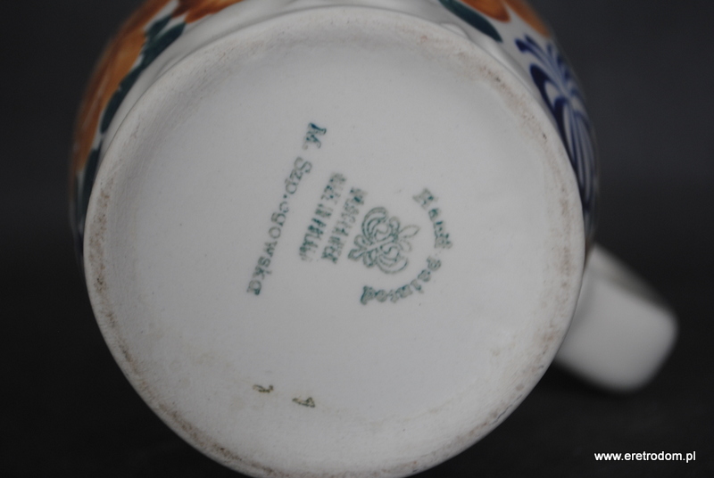 Duży kufel który może też pełnić funkcję dzbanka. Wyprodukowany we Włocławku. Fajans w kolorze śmietanki, ręcznie malowany w kwiaty.