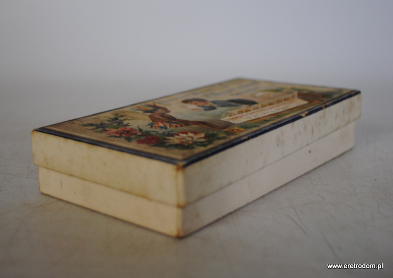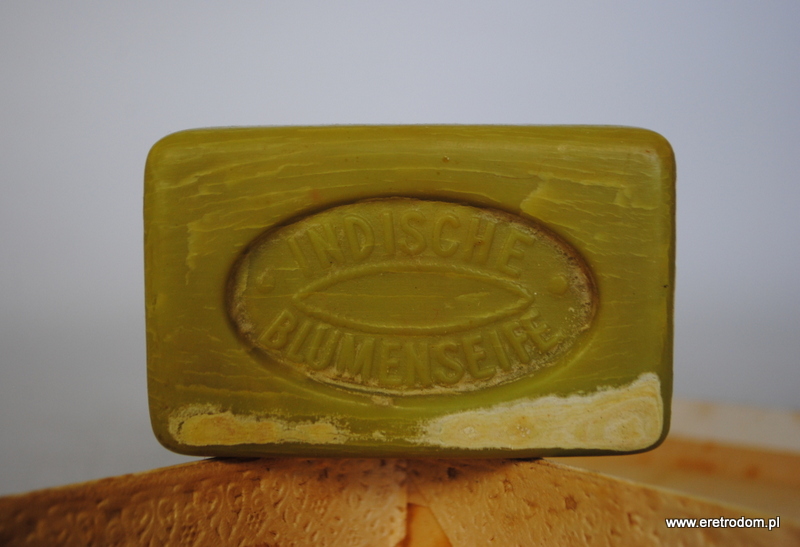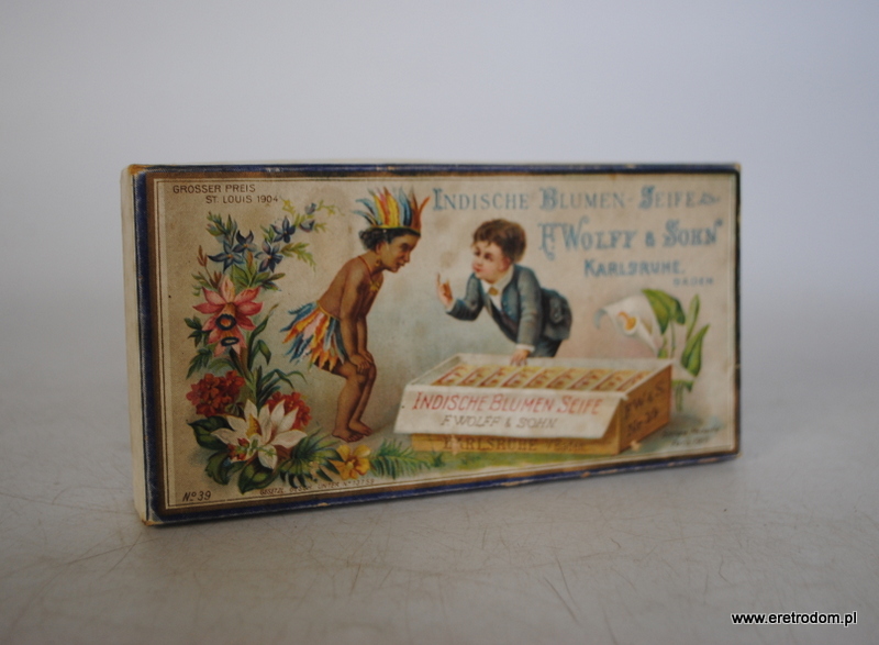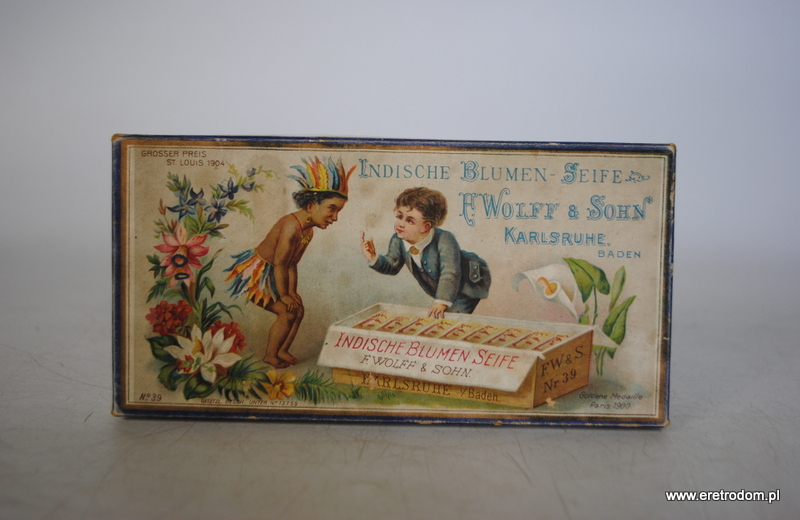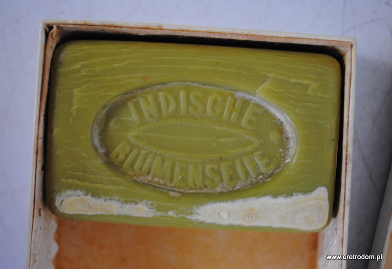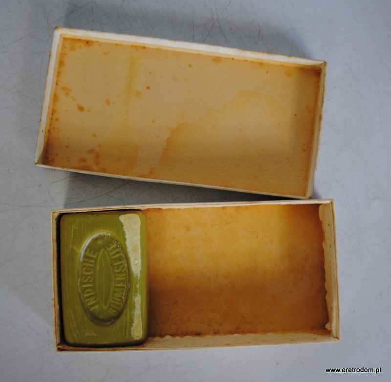 Pudełko wraz z 1 kostką mydła firmy F. Wolff & Sohn (Indyjskie mydło kwiatowe). Zestaw pochodzi z I poł XXw. Całość oryginalnie zachowana.