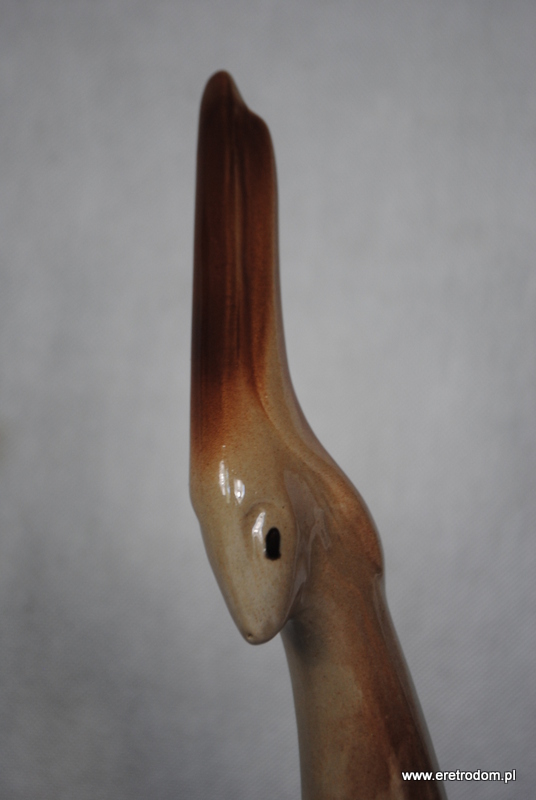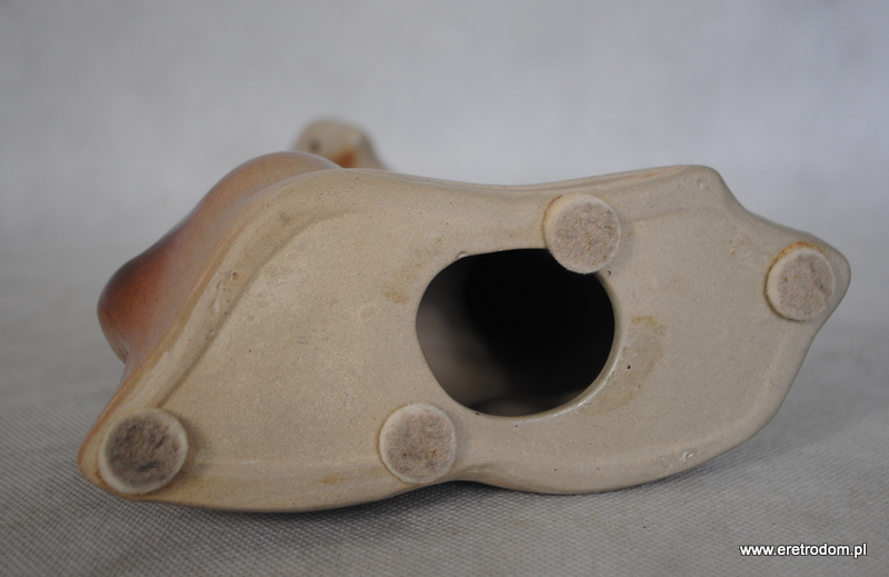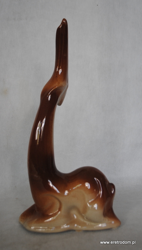 Figurka przedstawiająca sarnę/jelonka. Najprawdopodobniej wyrób pochodzi z krajów wschodnich. Ceramika malowana na brązowy kolor.