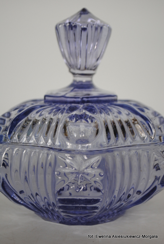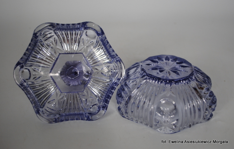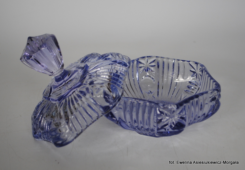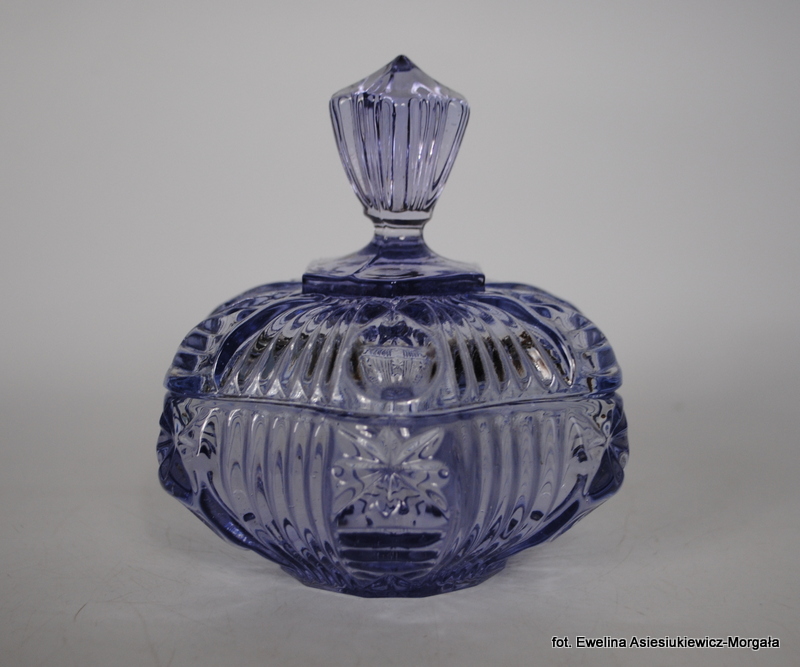 Bomboniera, produkcja HSG Ząbkowice, nr 2046 . Szkło barwione w masie, prasowane. kolor jasny fiolet.