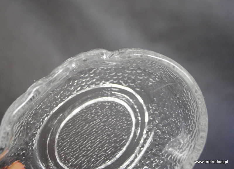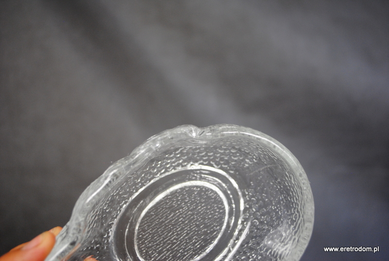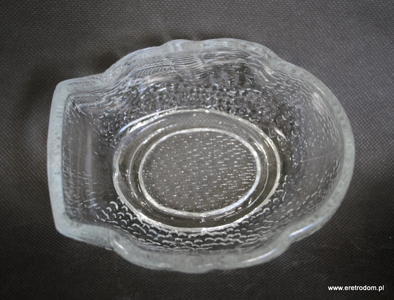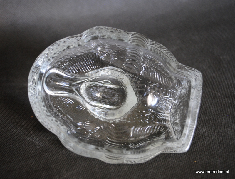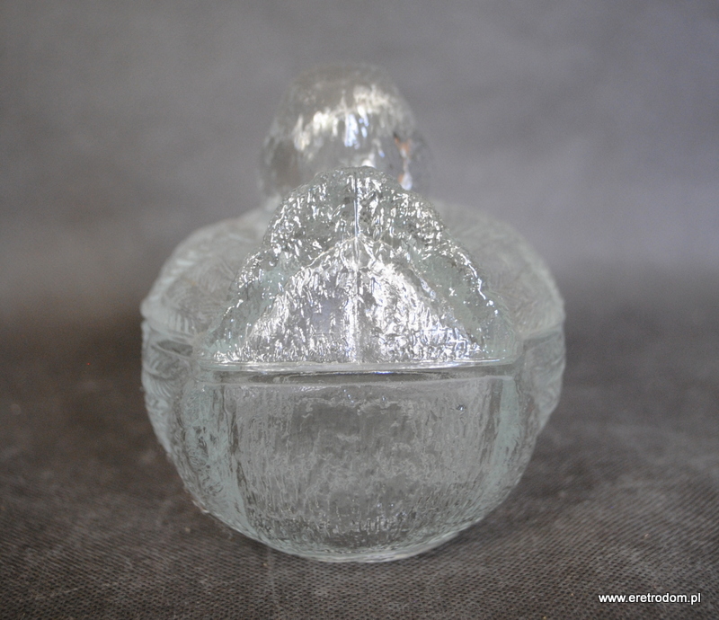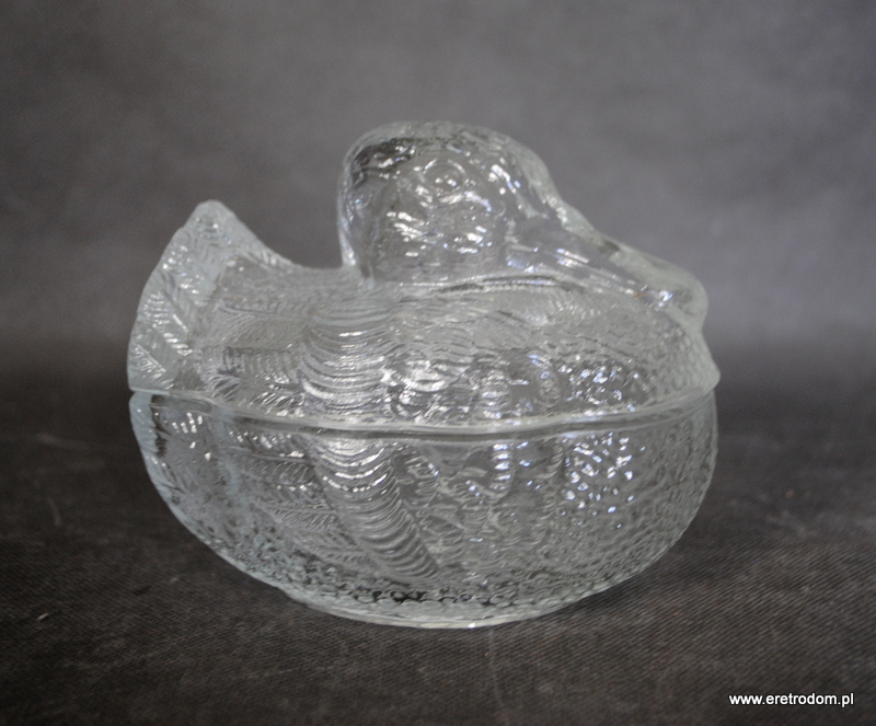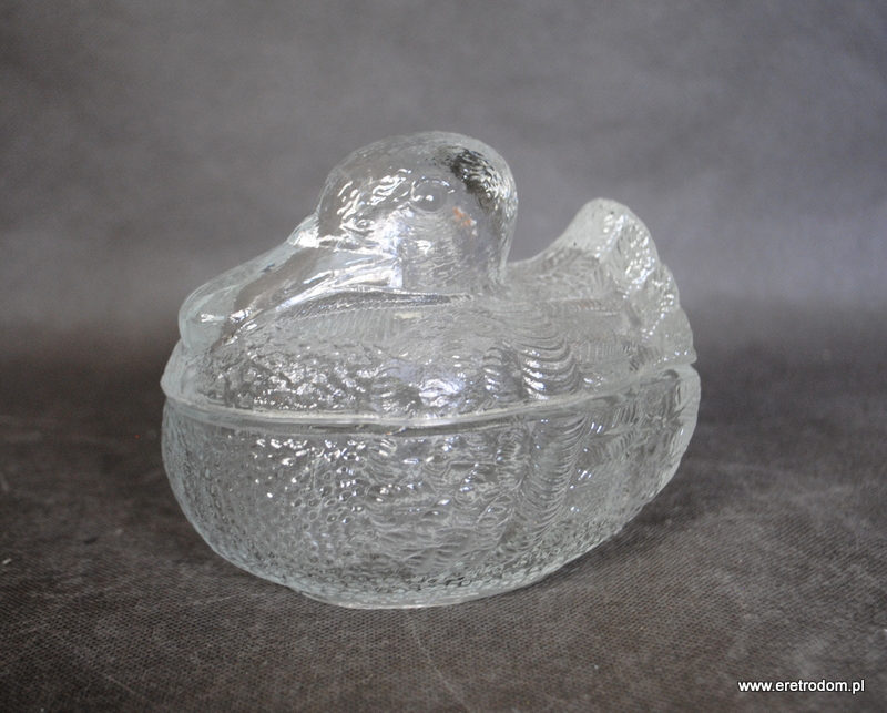 Bomboniera w kształcie kaczora. Wyprodukowana w HSG Ząbkowice. Szkło prasowane, bezbarwne.