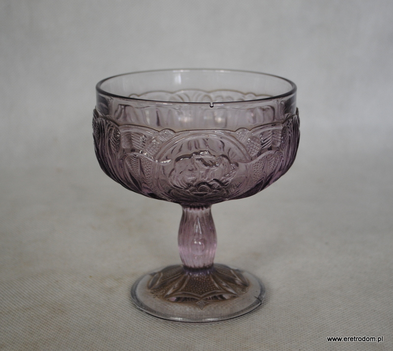 Cukiernica pochodząca z Huty Szkła Gospodarczego Ząbkowice. Wykonana według projektu Jana Sylwestra Drosta. Szkło prasowane, barwione w masie na jasny fioletowy kolor.