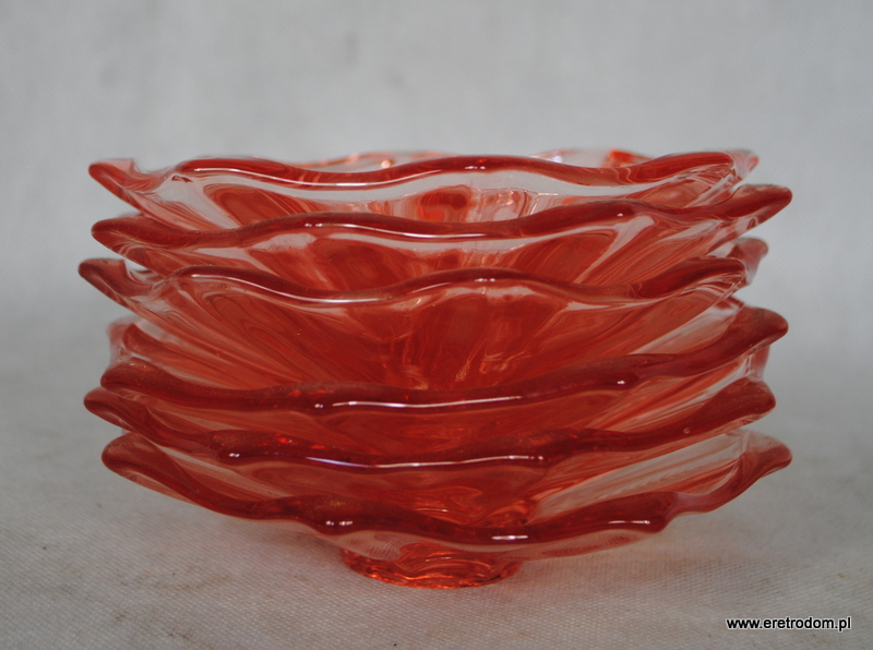 Zestaw 6 talerzyków/miseczek zaprojektowany przez J.S Drosta dla HSG Ząbkowice. Fason Dorota. Szkło sodowe, barwione w masie na rozalinowy kolor.