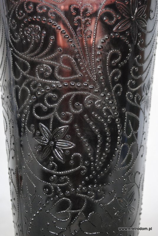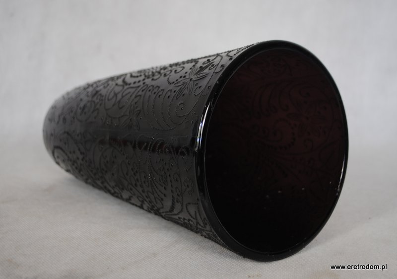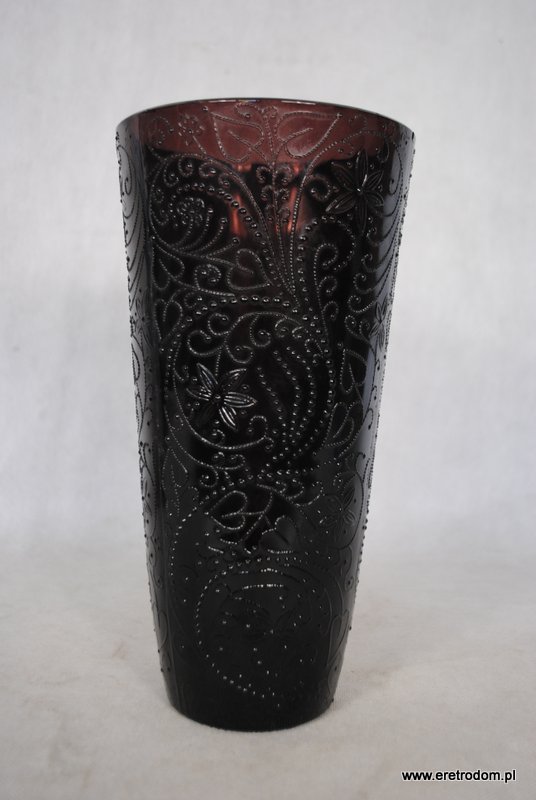 Wazon zaprojektowany przez J.S. Drosta dla HSG Ząbkowice. Fason Kaszmir. Szkło sodowe, prasowane, barwione w masie na kolor bakłażanowy.