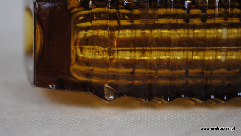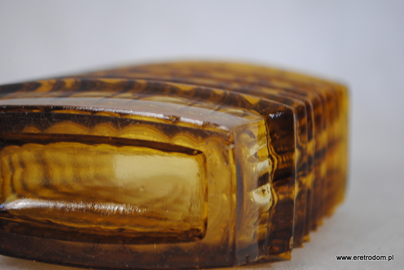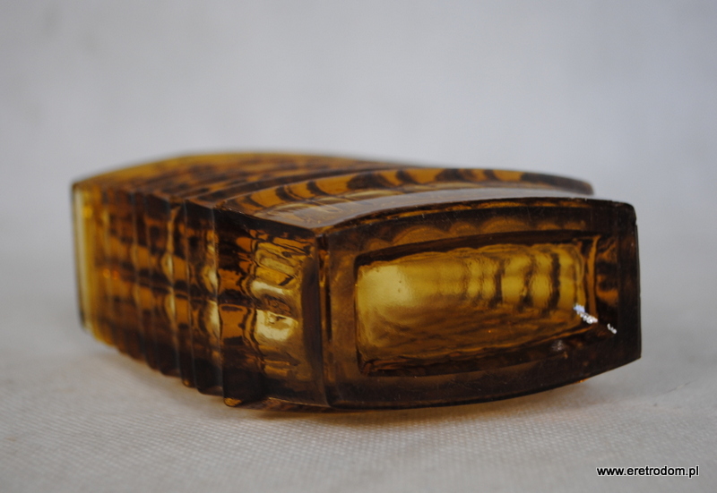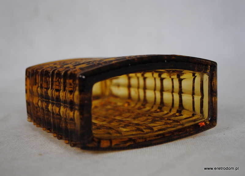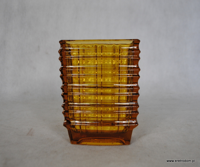 Wazon optyczny projektu J.S Drosta dla Ząbkowic. Szkło prasowane, barwione w masie na kolor miodowy.