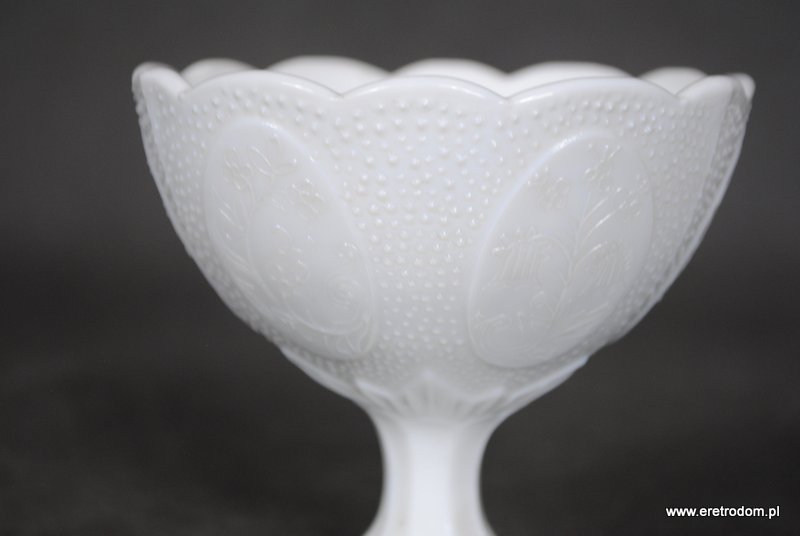Pucharek mini, produkcja HSG Ząbkowice. Szkło prasowane, barwione w masie na biały kolor.