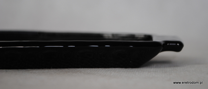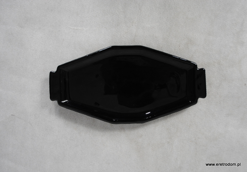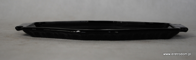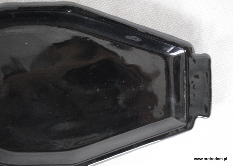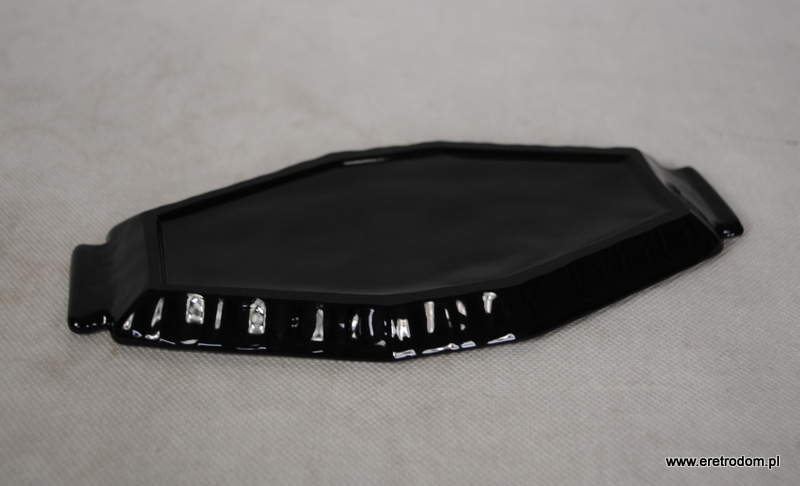 Taca wyprodukowana w HSG Ząbkowice nr 513 ( Minex). Szkło prasowane, barwione w masie na kolor czarny.