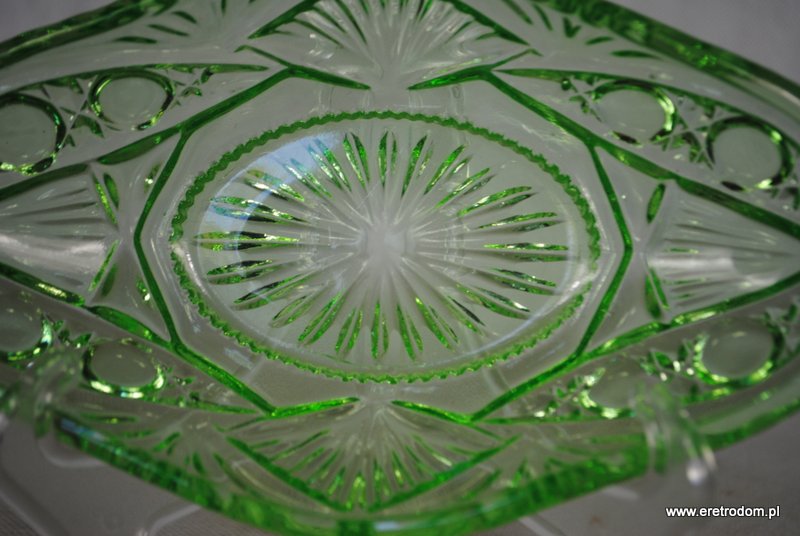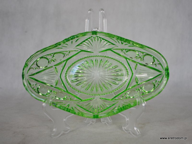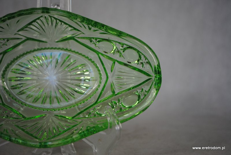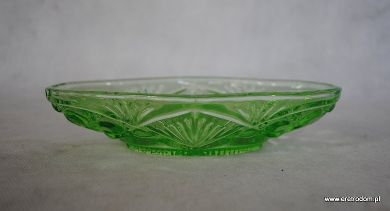 Salaterka czy tez niewielki półmisek wyprodukowany w Riihimäki Glass. Szkło prasowane, barwione w masie na zielony kolor.