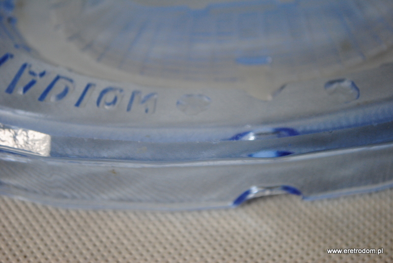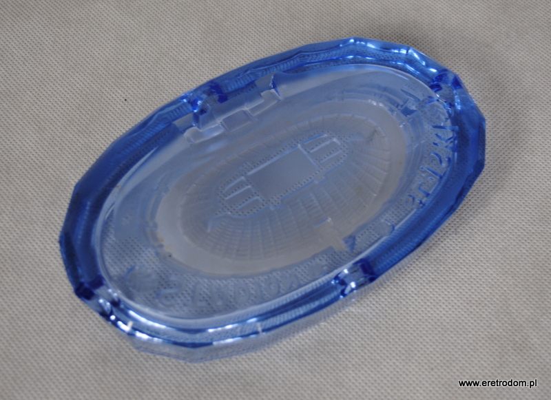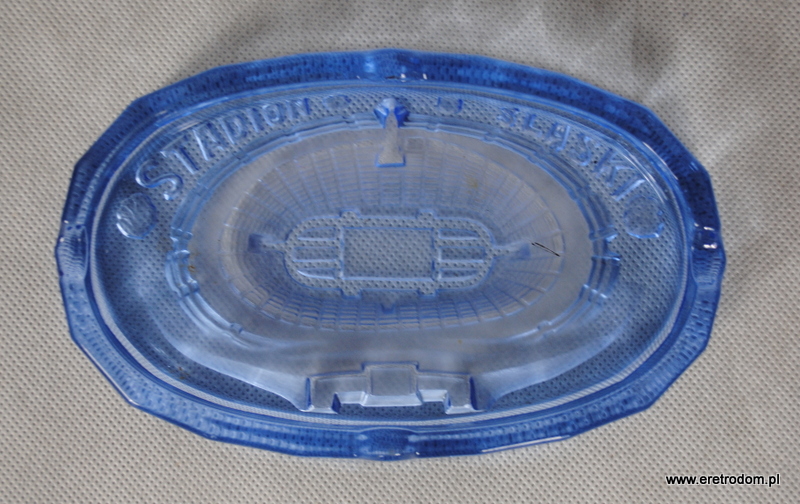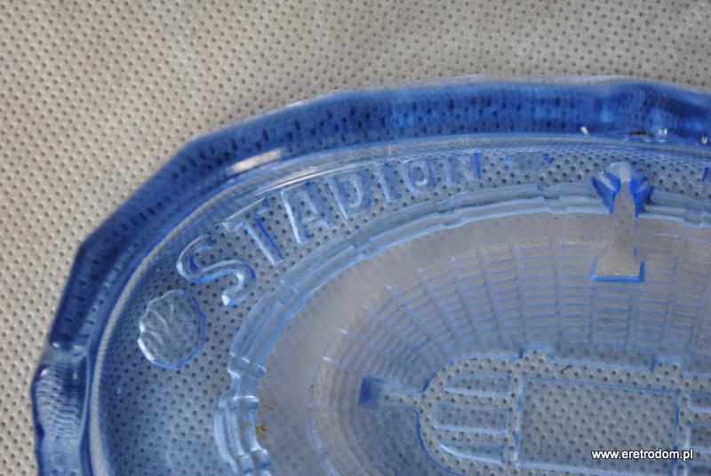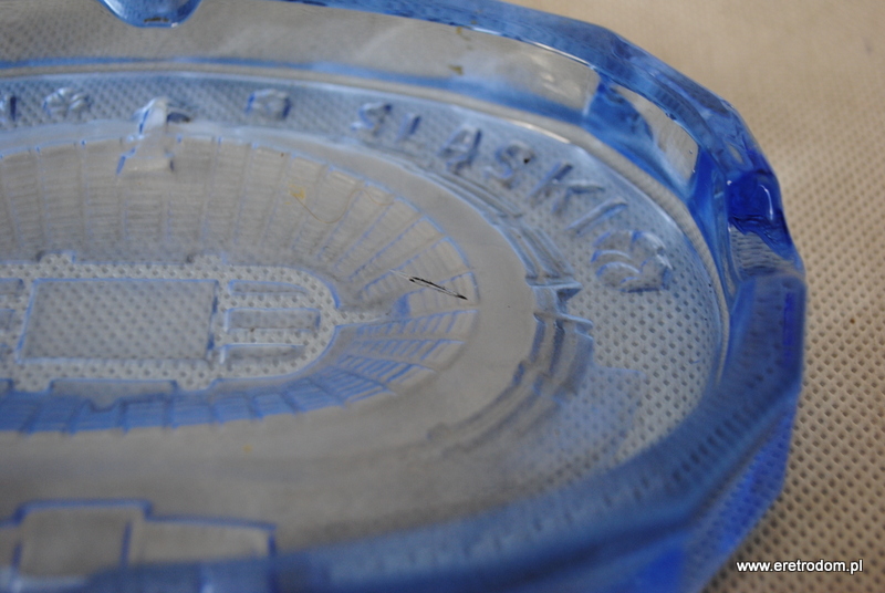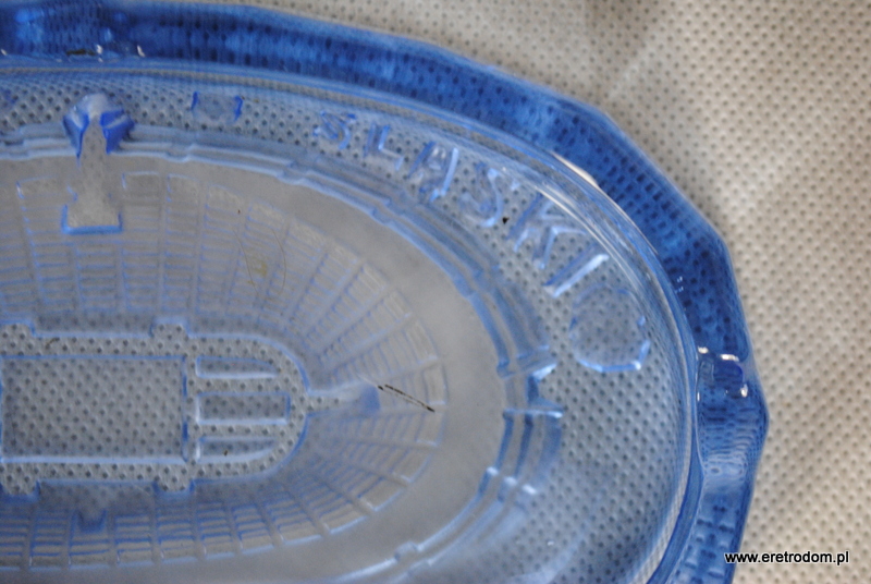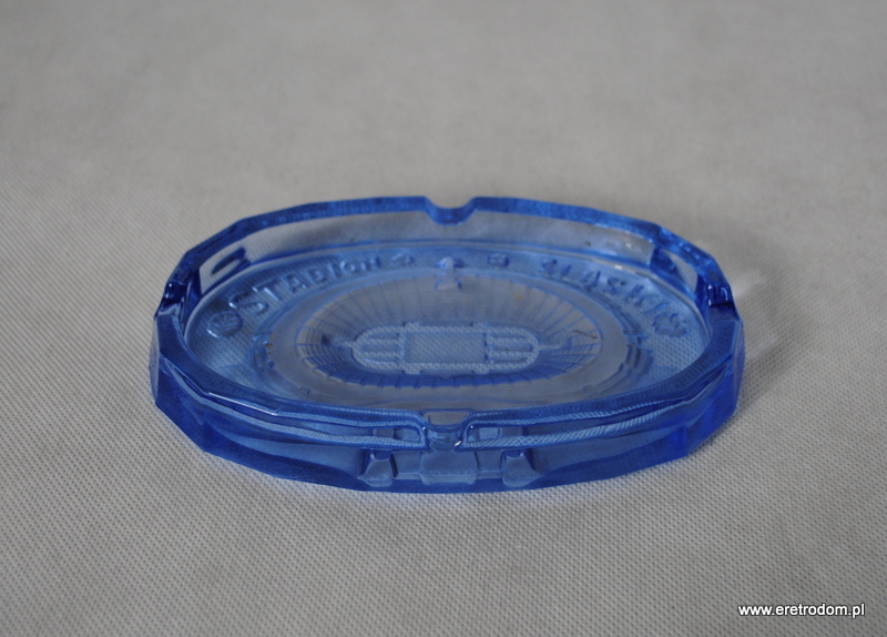 Popielnica reklamowa/okazjonalna, produkcja HSG Ząbkowice. Szkło prasowane, barwione w masie na błękitny kolor, częściowo matowione. W centralnej części widnieje budowla oraz napis- Stadion Śląski.