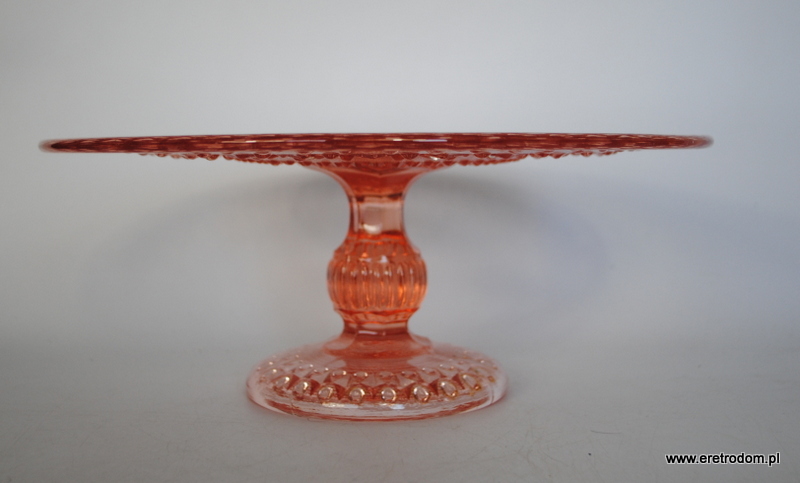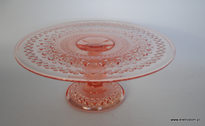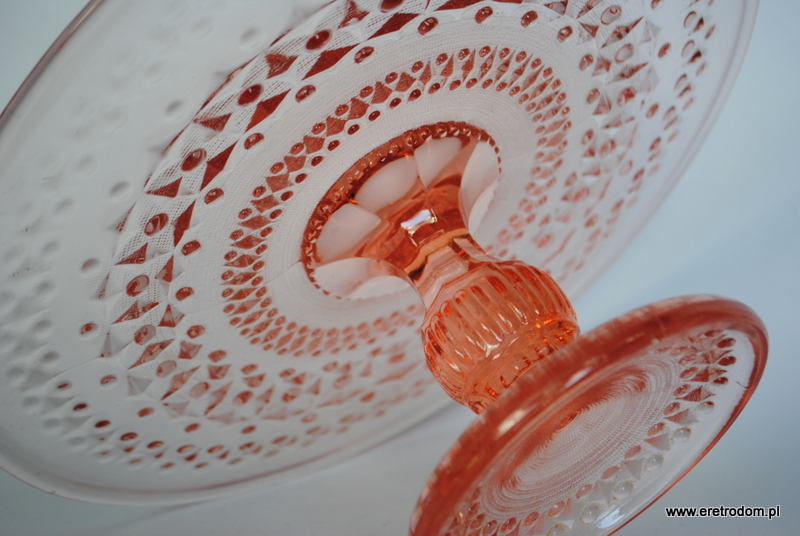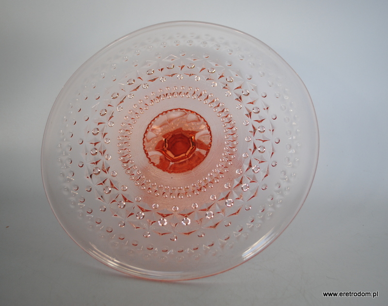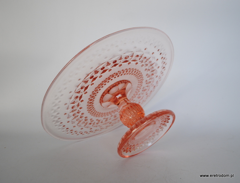 Tortownica, HSG Ząbkowice. Fason nazywany potocznie „Romby i guziczki”. Szkło prasowane, barwione w masie na kolor rozanilinowy.