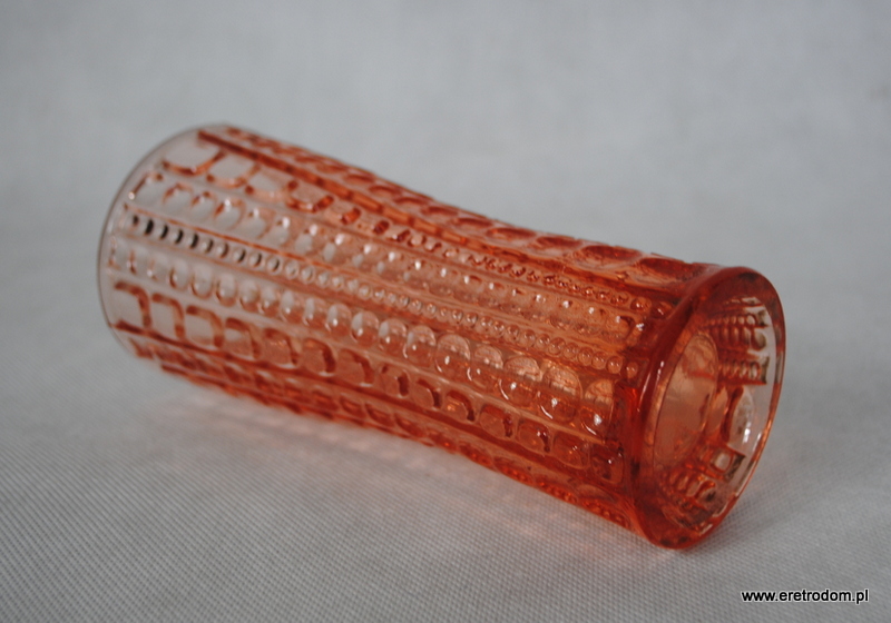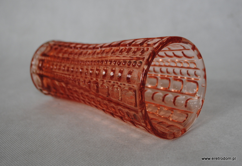 Wazon nazywany „Perełki”. Produkcja HSG Ząbkowice, projekt J.S. Drost. Szkło prasowane, barwione w masie na typowy dla wytwórni rozalinowy kolor.