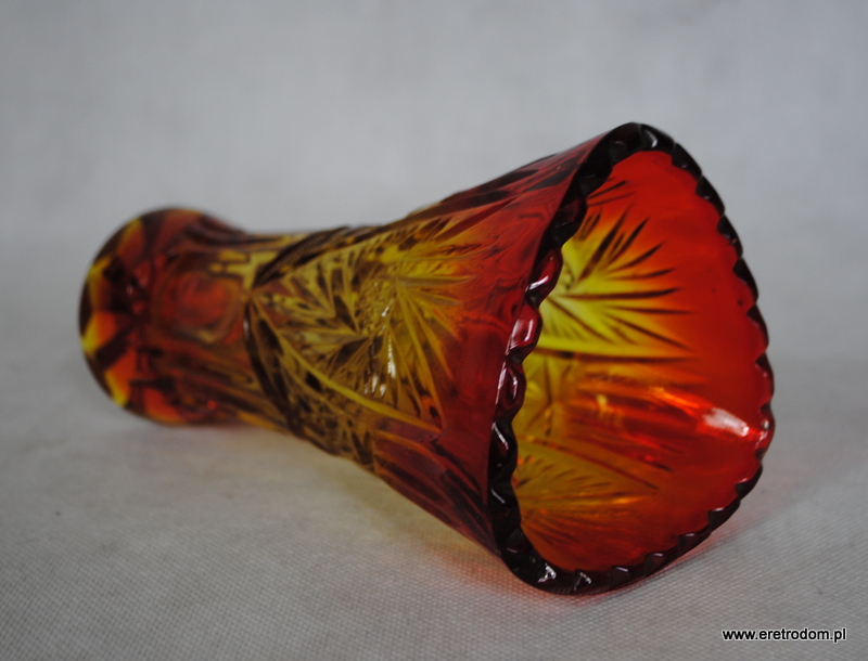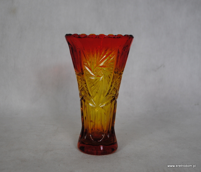 Ząbkowice, wazon z rozetami nr katalogowy z 1971 roku to 2259. Szkło prasowane, barwione w masie na kolor czerwono- żółty.