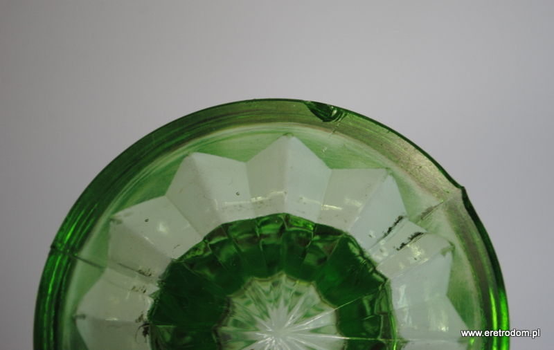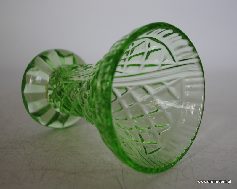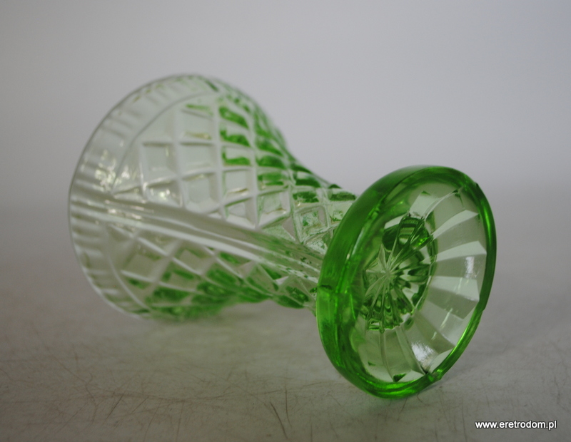 Wazon na konwalie numer 2065, produkcja HSG Ząbkowice. Szkło prasowane, barwione w masie na kolor zielony.