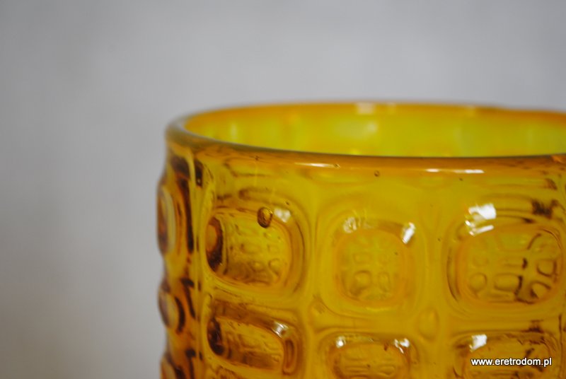 Wazon „Wulkan”, produkcja HSG Ząbkowice. Szkło prasowane, barwione w masie od dołu na pomarańczowy, na górze żółty kolor.