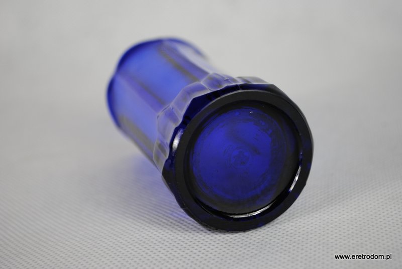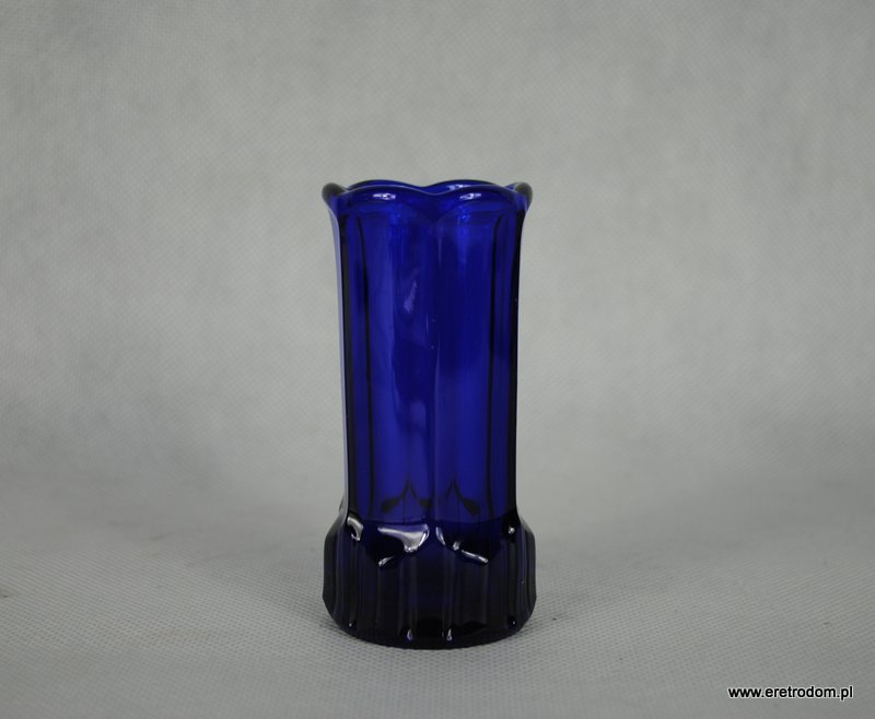 Uroczy wazonik, produkcja HSG Ząbkowice, numer katalogowy 2108/I. Szkło prasowane, barwione w masie na kolor kobaltowy.