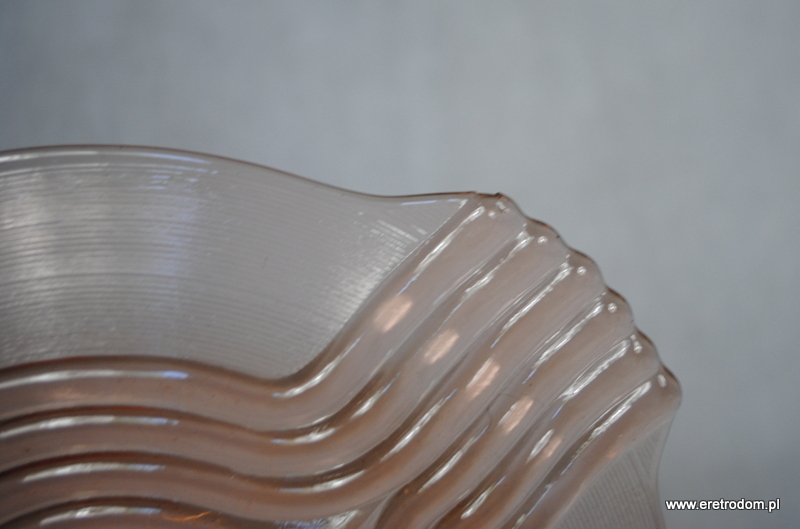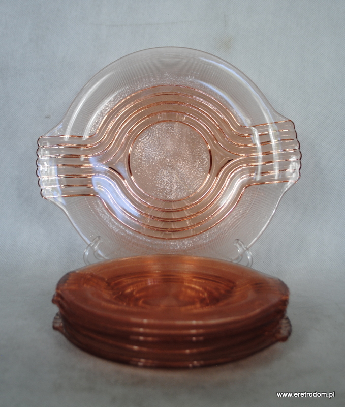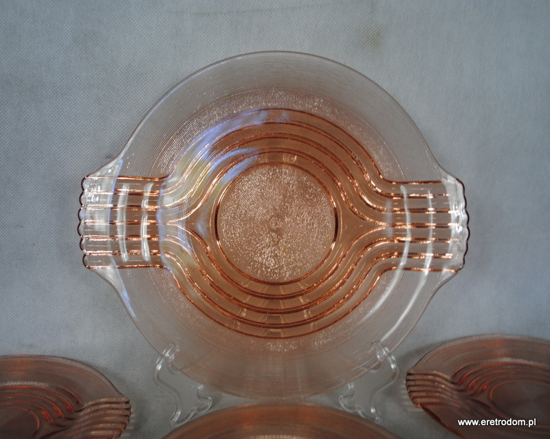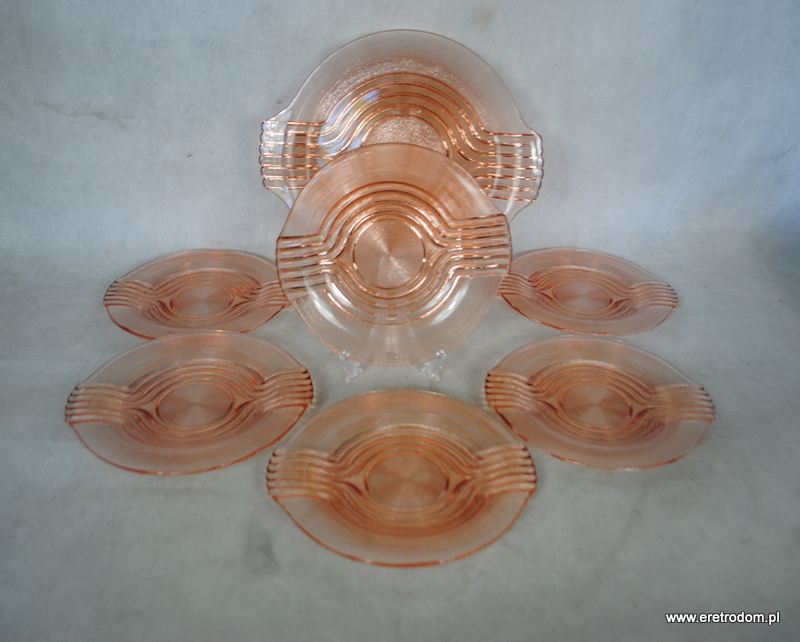 Zestaw talerzy Rondo, produkcja HSG Ząbkowice, proj. J.S. Drost. Szkło prasowane, barwione w masie. W skład zestawu wchodzi patera oraz 6 talerzyków deserowych.