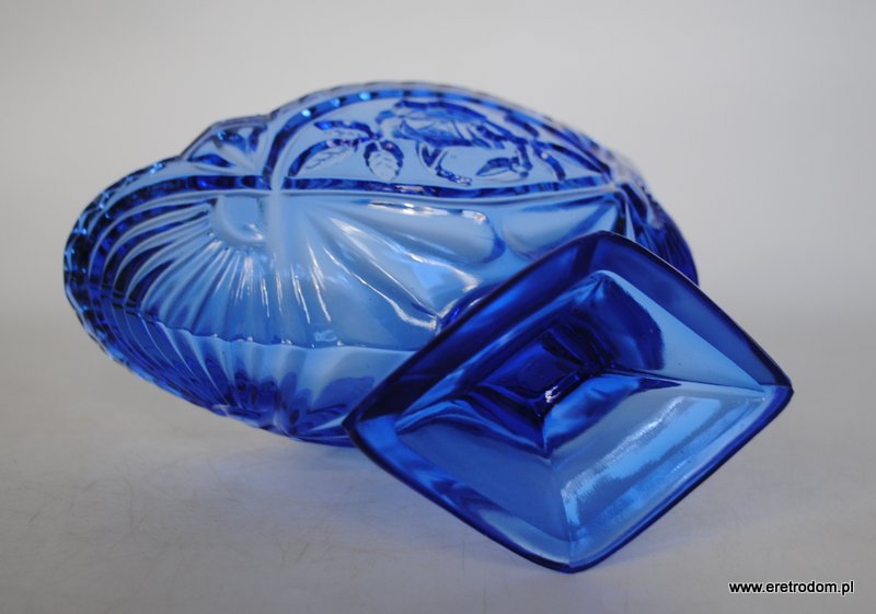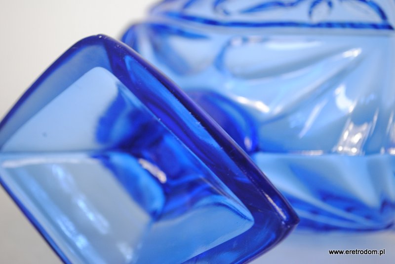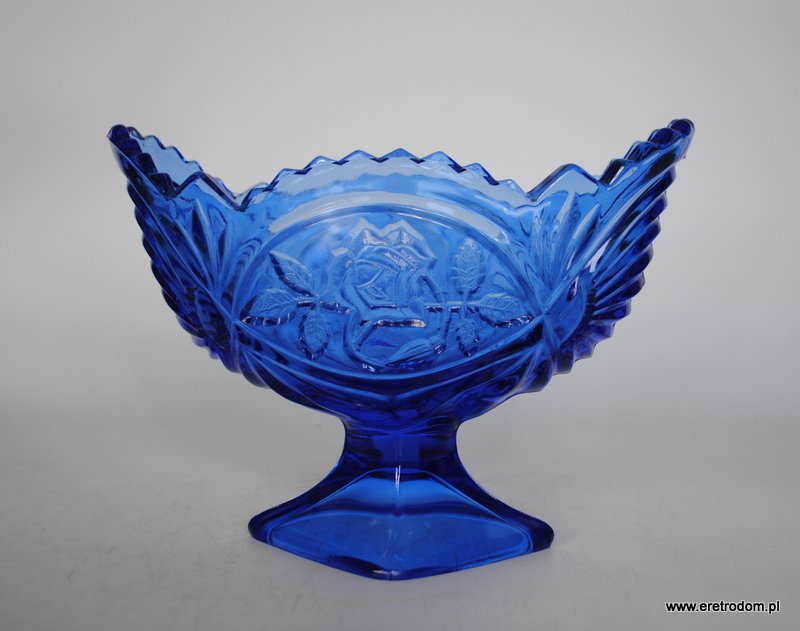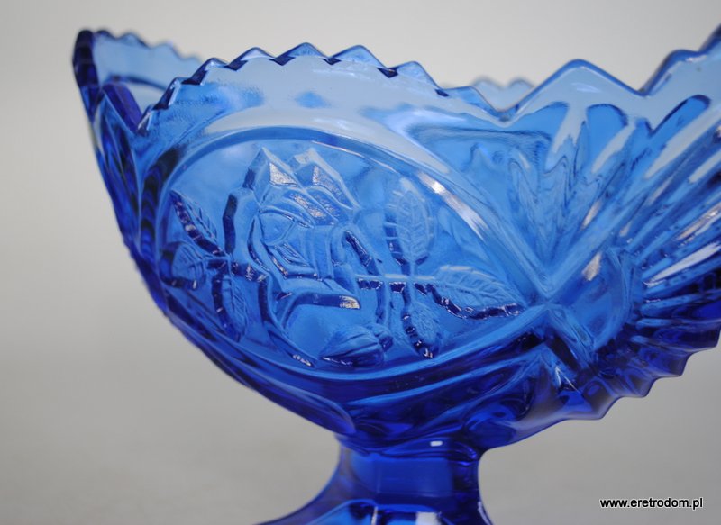 Żardiniera pochodząca z Huty Szkła Gospodarczego Ząbkowice. Szkło prasowane, barwione w masie na kolor niebieski.